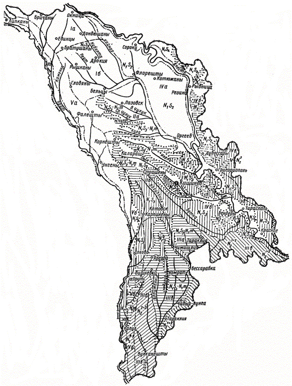 Рис. 5. Схематическая карта инженерно-геологического районирования МССР для целей дорожного строительства: