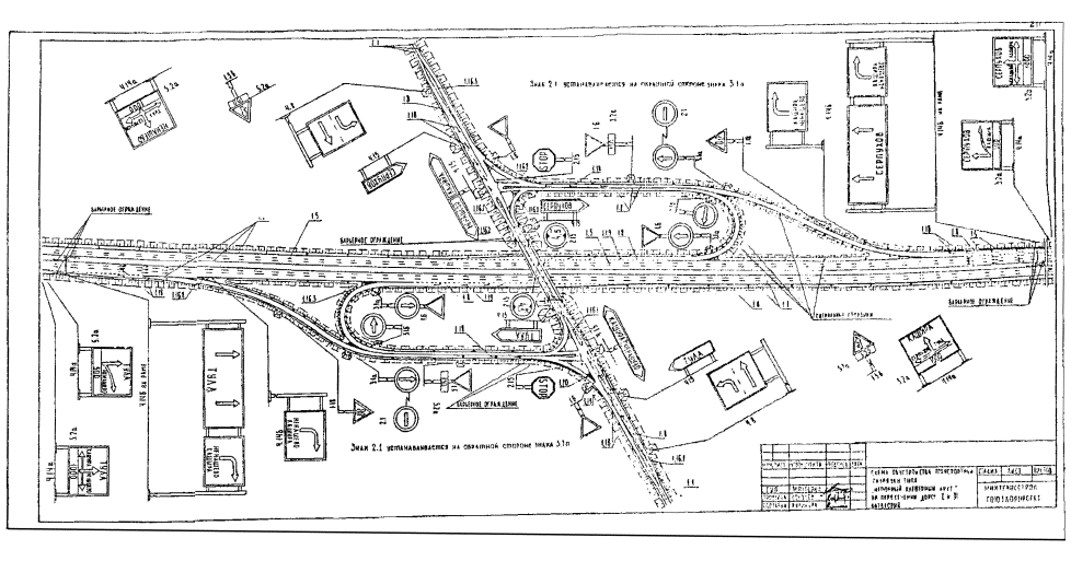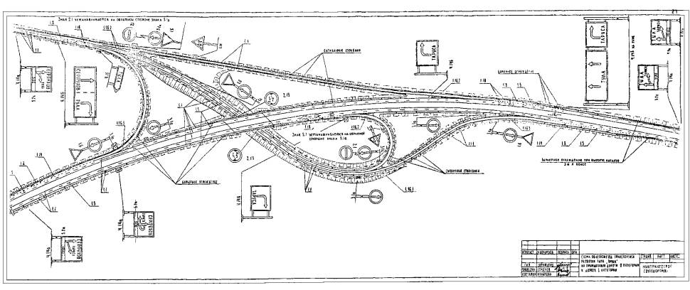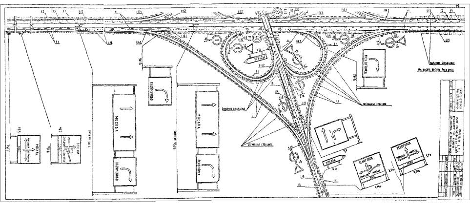 УКАЗАНИЯ Москва - 1978 г. СОДЕРЖАНИЕ ВВЕДЕНИЕРост скоростей и повышение интенсивности движения требуют постоянного совершенствования организации движения и всего комплекса мероприятий, обеспечивающего безопасность движения. Безопасность движения в пределах развязок движения определяется двумя основными факторами: - планировочными решениями транспортного узла и принятыми параметрами основных геометрических элементов; - правильным размещением дорожных знаков, своевременно информирующих водителей об изменениях направлений и режима движения, разметкой проезжей части, установкой на опасных участках ограждений и сигнальных столбиков. В настоящих «Указаниях» приведены данные по разметке проезжей части, установке ограждений, сигнальных столбиков, а также дорожных знаков для наиболее распространенных типов развязок движения на пересечениях автомобильных дорог в разных уровнях. Методические указания составлены на основе строительных норм и правил СНиП II-Д.5-72, технических указаний по проектированию пересечений и примыканий автомобильных дорог ВСН-103-74 Минтрансстроя, технических указаний Минавтодора РСФСР ВСН 23-75, ВСН-25-76 и в соответствии с требованиями стандартов ГОСТ 10807-71 «Знаки дорожные» и ГОСТ 13508-74 «Разметка дорожная», а также «Правил дорожного движения». «Методические указания» разработаны главным инженером проекта дорожного отдела Союздорпроекта т. Зарифьянц С.А. и отражают опыт работы по кругу рассматриваемых вопросов. Союздорпроект просит сообщать о всех замечаниях и пожеланиях, возникающих при использовании настоящих «Указаний». Начальник технического отдела Союздорпроекта К.М. Ротштейн Дорожная разметкаВ соответствии с ГОСТ 13508-74 «Разметка дорожная» разметкой являются линии, надписи и другие обозначения на проезжей части, бордюрах, элементах дорожных сооружений и обстановке дорог, устанавливающие порядок дорожного движения, показывающие габариты дорожных сооружений или указывающие направление дорог. Разметка применяется самостоятельно или в сочетании с дорожными знаками и другими средствами организации движения и является составной частью общей схемы организации движения транспорта. Разметка служит средством ориентирования и информации водителей об особенностях движения на участке дороги, а также является средством регулирования движения, определяя возможность осуществления водителем контроля за поперечным положением автомобиля на дороге. По своему назначению разметка делится на 2 группы - вертикальную разметку и горизонтальную разметку, причем последняя включает в себя: а) продольную разметку б) поперечную разметку в) другие виды разметки, предназначаемые для обозначения мест пешеходных переходов, островков безопасности, посадочных площадок, для обозначения мест, где водитель обязан уступить дорогу, для обозначения направлений движения по полосам, для обозначения приближения к сужению проезжей части и т.п. На развязках движения в сочетании с продольной разметкой основных многополосных дорог I и II категорий, где отделение полос движения осуществляется посредством разметки 1.5, применяются следующие виды разметки: 1.1 - толщиной 0,10 м, для обозначения края проезжай части съездов, разделения транспортных потоков противоположных направлений на двухпутных съездах, а также в местах при