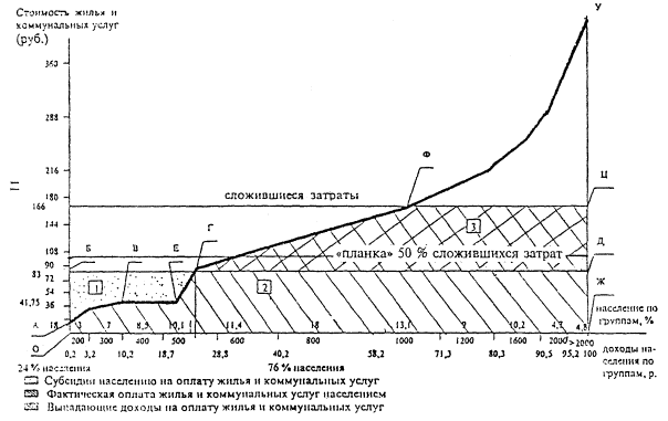 Для визуального восприятия результаты расчета могут быть приведены в графической форме (график 1). Для этого по оси абсцисс откладываются данные по удельному весу населения, соответствующие определенному среднедушевому доходу (колонка 1, 2 табл. 2). По оси ординат откладываются величины стоимости жилья и коммунальных услуг от 0 до 360 рублей, на которой изображаются максимально допустимые доли собственных расходов граждан на оплату жилья и коммунальных услуг соответствующих групп населения (колонка 4 табл. 2). Соединение точек АВЕГФУ позволяет построить кривую платежеспособной возможности населения на жилищно-коммунальные услуги. Прямой участок ВЕ свидетельствует о том, что группа населения с доходом, меньшим минимального прожиточного уровня, оплачивает не более 0,5 минимальной заработной платы. Площадь по кривой АВЕГФУ характеризует возможность различных категорий населения в оплате жилищно-коммунальных услуг в пределах максимально допустимой доли граждан в совокупном семейном доходе на эти цели, в нашем случае - 18 %. Если данную кривую совместить с прямой Б-Д, соответствующей установленному уровню оплаты за жилищно-коммунальные услуги (50 %), что в нашем случае соответствует 83 рублям, то полученный график позволит выделить: величину средств, необходимых для выплаты субсидий, - элемент АБГЕВ; величину средств, собираемых с населения на жилищно-коммунальные услуги, - элемент ОАВЕГДЖ; величину средств, недополучаемых жилищно-коммунальными предприятиями в связи с введением ограничений - 50 % (уровень оплаты населением за предоставляемые жилищно-коммунальные услуги) - элемент ГФЦД. График платежеспособной возможности населения при оплате жилья и коммунальных услуг по РФ на 1998 год
