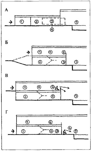 Варианты уровней выхода А - предпочтительный вариант - все помещения в одном уровне; Б - устройство пандусных входов на 2 уровня (максимальный уклон 1:12); В - допустимый вариант только при условии устройства лифта; Г - допустимый вариант (в уровне бассейна - дополнительные места для зрителей в креслах - колясках); 1 - входной вестибюль; 2 - раздевальные; 3 - душевые; 4 - кафе-бар; 5 - зал бассейна; 6 - места для зрителей Основная направленность специальных требований - создание условий для нормальных учебно-тренировочных занятий и соревнований спортсменов, а также исключение или сведение к минимуму риска получения травм. С этой целью вокруг игровых площадок в залах и на открытых плоскостных сооружениях предусматриваются зоны безопасности, в бассейнах делаются расширенные обходные дорожки, сооружения оснащаются системой информации и ориентации, устанавливается вспомогательное оборудование для передвижения спортсменов. Специальные правила соблюдаются при размещении спортивного оборудования. Кроме того, особые требования предъявляются к отделке стен и пола залов и помещений для спортивных занятий, к акустике, освещению и цветовому решению интерьера. Многие из специальных требований, предъявляемых к спортивным сооружениям различными группами инвалидов, сходны или совпадают. Однако имеются и противоречия. Так, например, для спортивных игр с использованием колясок или костылей инвалидов с ПОДА требуется шероховатый пол из пружинящих синтетических материалов темной окраски, при этом не допускаются никакие выступы или впадины на его поверхности. В то же время для игр инвалидов с ДЗ покрытие пола должно быть твердым и идеально гладким, а разметка площадок выполняется рельефными полосами. В плавательных бассейнах для инвалидов с ПОДА оборудуются специальные лесенки для спуска в воду, выступающие за основные габариты ванны, на обходных дорожках устанавливаются подъемники, предусматриваются скамьи для сидения и др. Для слепых спортсменов эти устройства могут явиться причиной травмы. Следует оптимизировать требования различных групп инвалидов, предъявляемые к сооружениям одного типа. Для этого в небольших спортивных сооружениях, где отсутствует возможность создания специализированных залов или ванн бассейна для отдельных групп инвалидов, предусматриваются специальные мероприятия, позволяющие использовать зал или бассейн инвалидам различных категорий. К ним относятся: определение размеров основных помещений, предназначенных для занятий определенной группы инвалидов, с учетом зон безопасности и систем информации и ориентации; нахождение компромиссных вариантов размещения вспомогательного и спортивного оборудования с учетом требований различных групп инвалидов (например, заглубление поручня, которым должен оборудоваться по периметру зал для слепых, в стену или устройство подъемника в бассейне с потолочным креплением, использование съемных разметок в залах для спортивных игр слепых, другие варианты); при выборе отделочных материалов для пола или стен необходимо учитывать требования всех групп инвалидов. Лишь в исключительных случаях, когда невозможно использовать одно и то же помещение для инвалидов различных категорий, при строительстве крупных или специализированных спортивных центров допускается устройство 