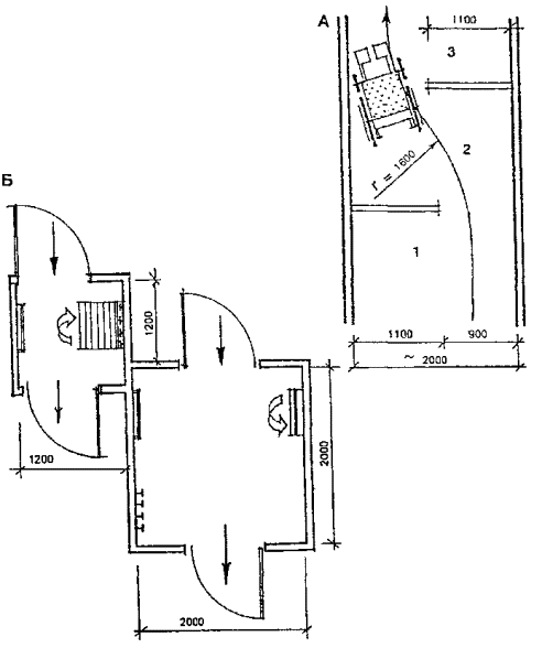 Элементы спортивных индивидуальных кабин для переодевания А - схема тамбура перед душевой: 1 - раздевальная; 2 - тамбур; 3 - душевая; Б - схемы проходных кабин различной величины Оборудуемые при помещениях «семейных раздевален» душевые и санузлы могут размещаться как в отдельном помещении, так и в одном с местом для переодевания.