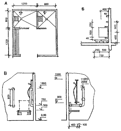 Блок раздевальных и душевых при ванне размером 16,6×8 м А - план: 1 - помещение раздевальной; 2 - зона для переодевания инвалидов; 3 - санузел стандартных размеров; 4 - санузел для «колясочников»; 5 - душевая стандартных размеров; 6 - душевая для «колясочников»; 7 - индивидуальная кабина для переодевания; 8 - шкафы для хранения домашней одежды; 9 - скамьи для переодевания; 10 - зона для хранения колясок и вспомогательных средств; Б - минимальные габариты проходов и шкафов в раздевальных Индивидуальные кабины для переодевания оборудуются при помещениях общих раздевален. Блок раздевальных может полностью состоять из индивидуальных кабин.