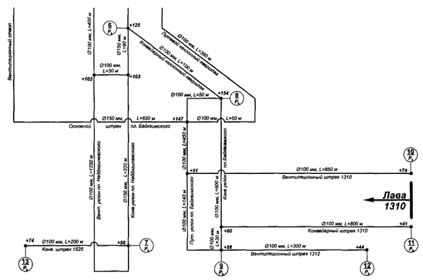 В знаменателе - манометр, установленный непосредственно на пожарный трубопровод. В числителе - порядковый номер манометра. В знаменателе - манометр, установленный в побудительной линии установки автоматического пожаротушения. Примечание. 1. Окружность - диаметром не менее 5 мм. 2. Буквы - высотой не менее 3 мм, красным цветом. Приложение БОбязательное Схема размещения манометров в сети пожарного трубопровода в системе ЦКВ ОАО «Шахта «Колмогоровская» ОАО «Компания «Кузбассуголь»