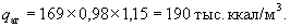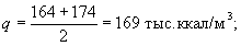 расчет удельного расхода: по прил. 1 (при Кг = 0,4, Кз = 0,1 и g = 3 т/м3) имеем: для Ку = 0,4 q = 145 тыс. ккал/м3; для Ку = 0,6 q = 170 тыс. ккал/м3. Интерполируя, получаем для Ку = 0,55 q = 164 тыс. ккал/м3. При Кг = 0,6, Кз = 0,1 и g = 3 т/м3 имеем: для Ку = 0,4 q = 155 тыс. ккал/м3; для Ку = 0,6 q = 180 тыс. ккал/м3. Путем интерполирования получаем для Ку = 0,55 q = 174 тыс. ккал/м3. Следовательно, для расчетного Кг = 0,5