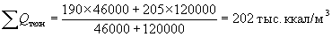 технологическая норма расхода: по прил. 2 для Кг = 1,2, Кз = 0,1 и g = 5 т/м3 имеем: при Ку = 1,25 q = 175 тыс. ккал/м3; при Ку = 1,5 q = 185 тыс. ккал/м3. Интерполируя, получаем для Ку = 1,43 q = 182 тыс. ккал/м3; коэффициенты: на заглубление (h = 0) по табл. 9 прил. 7 К1 = 1,02; на длительность активной тепловой обработки (9,5 ч) по табл. 3 прил. 7 К2 = 1; на потери через торцы щелей камеры из расчета объема активной зоны 650 м3 по табл. 11 прил. 7 Кз = 1; на невозврат конденсата по прил. 8 К4 = 1,1. Следовательно, агрегатная норма расхода тепловой энергии на каждую двухсекционную камеру qаг = 182 ´ 1,02 ´ 1,1 = 205 тыс. ккал/м3. В итоге средневзвешенная технологическая норма (без учета расхода тепловой энергии на подогрев заполнителей в зимнее время) будет равна: