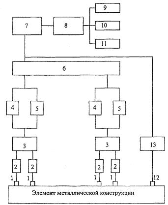 Приложение 6.2. АЭСОСТАВ АЭ ИЗМЕРИТЕЛЬНОЙ СИСТЕМЫ И ТРЕБОВАНИЯ К НЕЙ1. АЭ-аппаратура должна обеспечивать: фиксирование и вычисление параметров сигналов АЭ (активность, число импульсов, скорость счета, суммарный счет, амплитуда), оценивать вторичные параметры (величина относительной энергии, координата источника АЭ); обрабатывать АЭ-информацию и представлять в виде гистограмм и графиков. 2. Для выполнения АЭ-диагностики на объектах эксплуатации подъемников целесообразно, чтобы АЭ-аппаратура была смонтирована на транспортном средстве (микроавтобусе типа РАФ, УАЗ и т.п.). 3. Типовая конфигурация АЭ измерительной системы представлена на рис. 6.2.1. 4. Технические требования к элементам АЭ-системы 4.1. Датчики (АЭ-преобразователи). АЭ-преобразователи должны иметь следующие частотные зоны: 0,2 - 0,5 МГц, 0,2 - 2,0 МГц с коэффициентом преобразования 1,6´10 В/м; 0,5 - 1,0 МГц с коэффициентом преобразования 8´10 В/м и 0,02 - 0,2 МГц с коэффициентом преобразования 1,6´10 В/м. Датчики крепятся к конструкции при помощи магнитных держателей. 4.2. Кабель, передающий сигнал отдатчика, должен быть коаксиальным с волновым сопротивлением 50 Ом. С учетом минимизации наводок от электромагнитных полей длина кабеля от преобразователя до предусилителя, как правило, не превышает 0,5 м, а от предусилителя до усилителя - до 200 м. 4.3. Предусилители Коэффициент усиления предусилителя должен быть не менее 40 дБ. Диапазон рабочих частот предусилителя от 20 кГц до 2 МГц. Рис. 6.2.1. Структурная схема АЭ диагностического комплекса: 1 - датчик (АЭ-преобразователь); 2 - предусилитель; 3 - основной усилитель; 4 - блок измерения значений пиковой амплитуды, активности и скорости счета; 5 - блок определения разности времени прихода АЭ-сигнала (вычисления координат); 6 - устройство согласующее; 7 - устройство ввода-вывода; 8 - ПЭВМ типа IВМ РС; 9 - дисплей; 10 - принтер (плоттер) для отображения информации; 11 - накопитель на магнитном диске; 12 - датчик-имитатор; 13 - блок генерации импульсов 4.4. Основной усилитель Коэффициент усиления основного усилителя должен быть не менее 40 дБ при частотном диапазоне от 20 кГц до 2 МГц. Основной усилитель должен обеспечивать ступенчатую регулировку усиления с шагом 1 дБ, а также содержать фильтры с частотой среза: ФВЧ, кГц - 20, 200, 500, 1000; ФНЧ, кГц - 200, 500, 1000, 2000. 4.5. Устройство для измерения разности времен прихода Устройство должно обеспечивать измерение разности времен прихода сигнала для минимального количества преобразователей, необходимых для локализации источников АЭ. Разность времен прихода предпочтительно должна представляться в цифровой форме в диапазоне измерения от 8 до 800 мкс при погрешности измерения не более 3,0 мкс. 4.6. Блок для измерения величины пиковой амплитуды. Динамический диапазон регистрации амплитуды сигналов АЭ от 50 до 5000 мВ. 4.7. Оборудование для обработки данных Это оборудование должно иметь возможность вычисления координат АЭ-источников, величины относительной энергии АЭ и др., рассчитанных на основе информации о разности времен прихода АЭ-сигналов и характеристиках сигналов АЭ (по ГОСТ 27655-88) при следовании импульсов не чаще 1000 имп/с по каждому каналу и продолжительности накопления информации не менее 20 мин. Оборудование должно содержать компьютер, периферийные устройства и программное обеспечение. В качестве компьютера могут применяться любые ЭВМ из семейства IВ