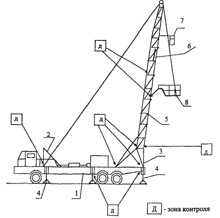 Вид А Рис. 5.1. Типовые места МК подъемника, где возможно образование трещин: Вид А - пересечение швов, нет выреза в ребре Рис. 5.2. Подъемник для капитального и текущего ремонта скважин: 1 - рама шасси; 2 - транспортная опора мачты; 3 - опора мачты; 4 - аутригеры гидравлические; 5 - опорная секция мачты; 6 - выдвижная секция мачты; 7 - балкон верхового рабочего; 8 - балкон для работы с трубами