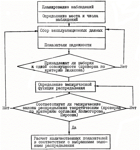 Рис. 1. Система сбора информации по надежности машин 3.4. Формы сбора эксплуатационных данных по надежности соответствуют плану испытаний [N; M; T], т. е. испытанию (наблюдению) подвергается N машин; отказавшие во время испытания (наблюдения) машины восстанавливаются. 3.5. В том случае, когда исследования проводятся для получения среднеотраслевых количественных показателей надежности, объем наблюдений Nдост следует определять с надежностью 0,95 по формуле