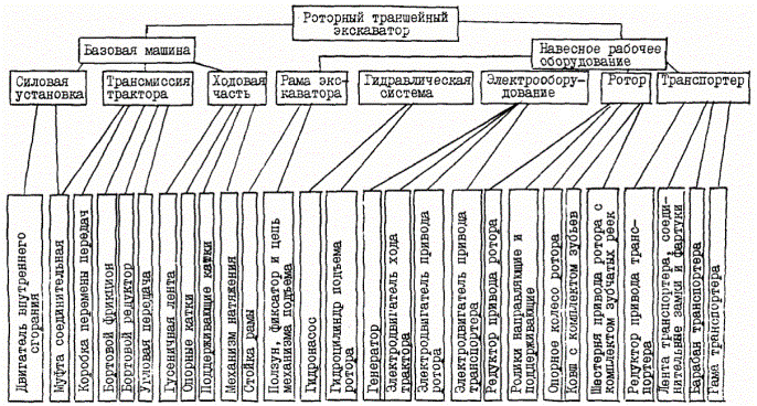 В том случае, если в расчетах необходимо использовать другие показатели надежности, то они рассчитываются с учетом интенсивности отказов по стандартным формулам теории надежности. 4.11. Пример схемы декомпозиции роторных траншейных экскаваторов приведен на рис. 5. Рис. 5. Пример схемы декомпозиции роторных траншейных экскаваторов (множество элементов {m}. Приложение Таблица 1 Форма учета эксплуатационных данных по надежности трубопроводостроительных машин