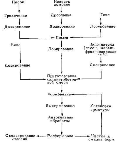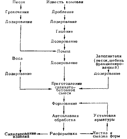 24. Морозостойкость силикатного бетона устанавливают замораживанием и оттаиванием образцов размером 100×100×100 мм по ГОСТ 10060-62. 25. Жесткость силикатобетонной смеси проверяют с помощью технического вискозиметра по ГОСТ 10181-62. 26. Контроль качества известково-кремнеземистого вяжущего и составляющих его компонентов в отдельности состоит в определении тонкости помола, удельной поверхности, содержания активных окисей кальция и магния в извести и вяжущем, однородности смешения компонентов вяжущего. 27. Тонкость помола и удельную поверхность вяжущего и молотого песка определяют по ГОСТ 310-60. 28. Содержание активных окисей кальция и магния в извести и вяжущем определяют по ГОСТ 9179-59. 29. Однородность перемешивания компонентов вяжущего устанавливают по сходимости процентного содержания в нем активных окисей кальция и магния. Из разовой пробы вяжущего весом 10 кг отбирают (из разных мест) 3 навески по 50 г. Содержание активных окисей кальция и магния определяют по ГОСТ 9179-59. Расхождение результатов определений не должно превышать 1 %. 30. Для извести и песка как компонентов вяжущего и мелкого заполнителя находят валовой химический состав, потери при высушивании при 105 °С и при прокаливании при 1000 °С. 31. Песок испытывают по ГОСТ 8735-65; щебень - по ГОСТ 8269-64; воду, применяемую для затворения бетонной смеси, - по ГОСТ 4798-57. Правила приемки и хранения исходных материалов 32. Сырьевые материалы для производства дорожного силикатного бетона должны поступать на завод и приниматься партиями. Поставку и приемку осуществляют: песка по ГОСТ 8736-62, щебня - по ГОСТ 8267-64 и ГОСТ 10260-62. 33. Известь негашеная комовая поставляется партиями по ГОСТ 9179-59 или вырабатывается на бетонном заводе из привозного известняка. 34. При приемке сырьевых материалов необходимо: а) осматривать материалы в транспортных средствах для определения их чистоты и однородности; б) требовать от поставщика груза паспорт, сертификат или другие документы, подтверждающие качество материалов; в) производить запись поступивших материалов в соответствующие журналы с указанием даты, времени поступления, количества и качества. 35. Сырьевые материалы должны храниться в условиях, исключающих возможность их загрязнения и смешения. Песок и щебень хранят по видам и фракциям в открытых или в закрытых складах. Комовую известь - в силосных складах. III. ТЕХНОЛОГИЯ ПРОИЗВОДСТВА ДОРОЖНОГО СИЛИКАТНОГО БЕТОНАПриготовление сырьевых материалов 36. В технологии производства дорожных изделий из силикатного бетона применяют два основных способа приготовления известково-кремнеземистого вяжущего - кипелочный, гидратный и их разновидности. Рис. 1. Технологическая схема производства дорожных изделий кипелочным способом Рис. 2. Технологическая схема производства дорожных изделий гидратным способом Кипелочный способ рекомендуется для изготовления изделий из крупнозернистых бетонных смесей, гидратный - для изготовления изделий из мелкозернистых смесей. Технологические схемы производства дорожных изделий кипелочным и гидратным способами приведены на рис. 1 и 2. 37. Технологический процесс приготовления вяжущего кипелочным способом (рис. 1) протекает следующим образом. Комовая известь подвергается дроблению в щековых или валковых, а затем - в молотковых дробилках. Дробленая негашеная известь, крупностью зерен не более 