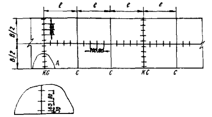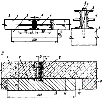 2.6. На основаниях из неукрепленных каменных материалов все швы сжатия покрытия армируют в соответствии с ВСН 139-68. 2.7. В случае, если установлена необходимость армирования швов сжатия, штыри следует располагать по схеме рис. 2. Рис. 2. Схема расположения штырей в швах сжатия С - шов сжатия; КС - контрольный шов сжатия 2.8. При нарезке подряд всех швов сжатия в затвердевшем бетоне увеличением глубины нарезки устраивают швы, которые срабатывают в первую очередь, т.е. играют роль контрольных. В такие швы устанавливают штыри в таком же количестве, что и в контрольные швы. Промежуточные швы сжатия не армируют. При толщине покрытия 20 см глубину паза шва увеличивают на 1 см, при толщине 22 - 24 см - на 2 см по сравнению с проектной. 2.9. Расстояние между швами расширения устанавливают по табл. 1 в зависимости от толщины покрытия и температуры воздуха во время укладки бетона. 2.10. При необходимости армирования швов сжатия конструкция и способ установки штырей должны обеспечить их проектное положение после бетонирования. 2.11. При устройстве покрытий без швов расширения в конце рабочей смены и при перерывах в бетонировании устраивают швы коробления, а перед мостами и путепроводами и после них - компенсационные швы расширения. Компенсационные швы расширения (рис. 3) предназначены для обеспечения в течение длительного срока эксплуатации устойчивости и проектного положения мостов и путепроводов, нарушение которых возможно в связи с высокими напряжениями сжатия, возникающими в покрытии в жаркий период года. 2.12. Поперечные швы коробления (рис. 4) устраивают с гладким вертикальным торцом, нагрузка с плиты на плиту передается посредством штырей, располагаемых через 40 см, и с цилиндрическим пазом вдоль торца, что обеспечивает ту же передачу нагрузки с плиты на плиту при меньшем количестве штырей (через 60 см). Рис. 3. Конструкции компенсационных швов расширения I и II типов: 1 - плита покрытия; 2 - подшовная плита; 3 - швеллер; 4 - арматурные стержни; 5 - клинья; 6 - болт крепления; 7 - заполнитель; 8 - доска; 9 - цементогрунт; 10 - зазор; 11 - битуминированная бумага или эмульсия; 12 - тиокол или другой эластичный материал Рис. 4. Конструкции швов коробления с гладким вертикальным торцом (а) и с цилиндрическим пазом вдоль торца (б) 3. Планировка земляного полотна3.1. Задел земляного полотна должен обеспечивать фронт работ по устройству дорожной одежды в соответствии с принятым темпом. При строительстве земляного полотна и дорожной одежды в течение одного календарного года (п. 1.7 СНиП III-Д.5-73) разрыв по времени между окончанием земляных работ и началом строительства дорожной одежды устанавливается проектной организацией. 3.2. Высотные отметки земляного полотна должны иметь только припуск на срезку при чистовом профилировании, производимом профилировщиком при работе с автоматической следящей системой. При этом отклонение копирной струны от проектных отметок не должно превышать по вертикали и горизонтали ± 5 мм. Стойки копирных струн должны находиться на расстоянии 10 - 15 м друг от друга. При устройстве виражей расстояние между стойками должно быть 4 - 5 м. 3.3. Лишний грунт, образующийся при чистовом профилировании, удаляется через боковые окна профилировщика для создания боковых валиков - упоров, ограничивающих распределение материала основания по ширине. 3.4. При отсыпке земляного полотна