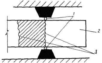 пор 14. Для определения рекомендуемых параметров поровой структуры на образцах бетона необходимо иметь: весы с приспособлением для гидростатического взвешивания, обеспечивающие взвешивание образцов массой до 500 г с точностью до 0,1 г, а образцов массой более 500 г с точностью до 1,0 г; сушильный шкаф, обеспечивающий заданный режим сушки (при 105 - 110 °С) с точностью ±5 °С; устройство для отсчета времени (часы, секундомер). 15. Для испытаний отбирают образцы-пробы определенных размеров и формы, чтобы исключить влияние размеров образца на результаты определений параметров поровой структуры бетона. Пробы отбирают из контрольных образцов-балок или кубов, формуемых при подборе состава смеси и при текущем контроле прочности бетона, а также из образцов-кернов, отобранных из бетонного покрытия. Количество проб в каждом случае должно составлять не менее трех, толщина их должна быть равна приблизительно 7 см. 16. Пробы бетона из контрольных образцов-балок или кубов отпиливают на камнерезных станках или откалывают на прессе с помощью двух металлических стержней так, чтобы сохранить поперечное сечение контрольного образца (рис. 2). Керны для отбора проб должны выпиливаться непосредственно из покрытия так, чтобы не нарушить структуру бетона (например, алмазным кругом). Образцы-пробы бетона можно также откалывать или отпиливать от кернов бетона цилиндрической формы (см. рис. 2), диаметр которых должен быть не менее 5 см, а высота отпиливаемой или откалываемой части - 7 - 10 см. 17. Для контроля качества поровой структуры бетона в покрытии важное значение имеет место отбора проб. Как правило, следует отбирать образцы из верхнего слоя покрытия. При необходимости оценки параметров пористости бетона по толщине покрытия образцы пробы можно отбирать послойно с толщиной слоя приблизительно 7 см. 18. При определении показателей крупности и однородности пор рекомендуется использовать пробы бетона, имеющие форму, близкую к кубической, с ребром около 7 см. Рис. 2. Схема откалывания образцов-проб от контрольных образцов бетона: 1 - металлические стержни гладкие из высокопрочной стали Æ 5 мм; 2 - контрольный образец-балка; 3 - намечаемые плоскости раскола (заштрихован образец-проба) 19. Образцы-пробы бетона, предназначенные для определения параметров поровой структуры, должны иметь четкую несмываемую маркировку. 20. До начала испытания (до взвешивания) выявленные на образцах отдельные дефекты (раковины, трещины, посторонние включения и т.п.) следует зафиксировать в журнале испытаний. Резко выступающие места на поверхности образца должны быть устранены (например, шлифовкой), так как их разрушение в процессе испытаний будет искажать полученные результаты. Поверхность образцов-проб должна быть очищена от пленкообразующих материалов, препятствующих водонасыщению бетона. 21. Подготовленные и высушенные до постоянной массы при температуре 105 - 110 °С (по ГОСТ 1273037) образцы-пробы охлаждают в эксикаторе над хлористым кальцием или силикагелем до комнатной температуры (20 ± 2 °С) и взвешивают на воздухе (т0). Затем образец-пробу помещают в воду, температура которой 20 ± 2 °С. Над образцом должен быть слой воды не менее 2 см. Через 5 суток*) непрерывного насыщения в воде образец вынимают из воды, обтирают влажной тканью и взвешивают на воздухе (т) и затем в воде (т1). *) Для ускоренного определен