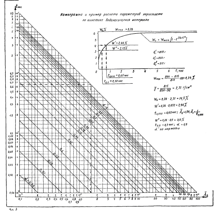 Для исследований цементного камня, раствора и бетона из жидкостей наиболее целесообразно использовать воду. Рекомендуемые образцы - кубы с ребром 7 см. Перед испытаниями образцы высушивают. Кинетику водопоглощения фиксируют либо непрерывным гидростатическим взвешиванием, либо дискретно в определенные моменты времени. Для определения параметров поровой структуры используется номограмма (см. рис. 3)*). *) Построение полной кривой насыщения бетона водой допускается производить по отдельным точкам, получаемым путем взвешивания водонасыщаемых образцов через 10, 30, 60 мин, 2, 3, 4, 5 и 6 час, 1, 2, 3, 4, 5 суток. Параметры поровой структуры, определенные по кинетике водопоглощения, могут быть использованы для оценки влияния на структуру любых технологических факторов производства бетона и условий его эксплуатации, а также увязаны с определенными физико-механическими свойствами бетонов. Приложение 2Пример определения параметров поровой структуры бетонаПараметры поровой структуры для оценки свойств дорожного бетона при пробном бетонировании определяли на образце-пробе размером 15×15×7 см, отколотом от контрольного образца-балки - 15×15×55 см, и образце-пробе, отколотом от верхней части керна диаметром 13 см, высверленного из бетонного покрытия (возраст бетона 28 суток). Результаты испытаний приведены в таблице.