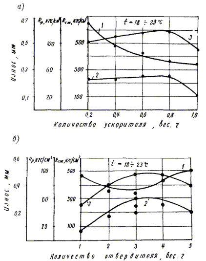 Морозостойкость каменной мелочи при непосредственном замораживании - Мрз. 50. Содержание зерен пластинчатой (лещадной) формы не должно превышать 15 %. Песок - кварцевый, крупный, с модулем крупности (МК) более 2,5 (содержание зерен крупнее 0,63 мм более 50 %), а также средний с модулем крупности (МК) 2,5 - 2,0 (содержание зерен крупнее 0,63 мм - 35 - 50 %). Кварцевый песок должен быть чистым и не иметь посторонних примесей. Содержание в песке зерен, проходящих сквозь сито с отверстиями 0,14 мм, должно быть не более 15 %. Количество пылеватых, глинистых и илистых частиц, определяемых методом отмучивания, не должно превышать 1 % по весу. Минеральный порошок для полимербетонной смеси получают из известняков, доломитов (прочность не менее 200 кгс/см2) и битуминозных известняков, не содержащих загрязняющих примесей. Минеральный порошок должен быть сухим, рыхлым, не комковаться; при мокром рассеве через сито с отверстиями 1,25 мм должно проходить не менее 100 % по весу; 0,315 мм - не менее 90 %; 0,071 мм - не менее 70 % по весу; пористость при уплотнении нагрузкой 300 кгс/см2 не должна превышать 35 % по объему. 18. Для приготовления эпоксидного связующего могут быть использованы: - эпоксидная смола марки ЭД-5 (ГОСТ 10587-63)* или эпоксидная смола марки ЭИС-1 (ТУ 38-109-1-71); - отвердитель - полиэтиленполиамин (СТУ 49-25-29-62); - пластификаторы (модификаторы, эластомеры): дибутилфталат (ГОСТ 8728-66), полиэфир марки ПН-1 (СТУ 30-140-86-63), полиэфир марки МГФ - 9 (ТУМХПБУ-17-56), тиокол марки НВТ (ВМРТУ 6-04-174-64), тиокол марок I или II (МРТУ 6-04-156-63), фуриловый спирт (СТУ 89-257-62), каменноугольный деготь марки Д-3 или Д-4, или Д-5 (ГОСТ 4641-49) , жидкий битум марки МГ-70/130 (ГОСТ 11955-66). * С 1973 г взамен смолы марки ЭД-5 выпускается смола марки ЭД-20 (ГОСТ 10587-72). 19. Для приготовления полиэфирного связующего требуются: - полиэфирная смола-лак (раствор полиэфирмалеинатной ненасыщенной полуфабрикатной смолы в стироле, бутилацетате и ацетоне) марки ПЭ-246 (МРТУ 6-10-791-68); - ускоритель - нафтенат кобальта (СТУ 30-14195-64); - отвердитель - перекись циклогексанона (поставляется в комплекте с полиэфирной смолой). СОСТАВЫ ПОЛИМЕРБЕТОНА НА ЭПОКСИДНОЙ ИЛИ ПОЛИЭФИРНОЙ СМОЛЕ20. При проектировании состава полимербетонной смеси на эпоксидной смоле подбирают зерновой состав минеральной части, состав эпоксидного связующего и весовое соотношение минеральной части и эпоксидного связующего. 21. Минеральная часть полимербетонной смеси на эпоксидной смоле состоит из каменной мелочи размером 2,5 - 1,25 мм или 5,0 - 2,5 мм (65 - 70 %) и крупнозернистого или среднезернистого кварцевого песка (30 - 35 %). 22. Составы эпоксидного связующего приведены в табл. 3. 23. Весовое соотношение эпоксидного связующего и минеральной части любого из рекомендуемых составов полимербетонной смеси на эпоксидной смоле 1 : 5 - 1 : 7. 24. Для приготовления эпоксидного связующего, наполненного песком (состав № 4), рекомендуется в эпоксидное связующее составов № 1, 2, 3 ввести кварцевый крупнозернистый или среднезернистый песок в соотношении 1 : 1. Таблица 3