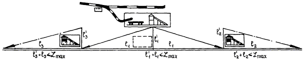 Принципиальная схема рационального размещения прирельсовых баз и ЦБЗ для приготовления бетонных смесей при использовании высокопроизводительных комплектов машин типа «Автогрейд»: l'1 + l1 - дальность транспортировки смеси с прирельсового завода; l'2 + l2; l'3 + l3 - дальность транспортировки смеси с притрассового завода; Lmax - максимально возможная дальность транспортировки смеси.