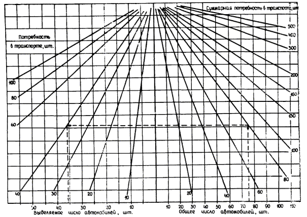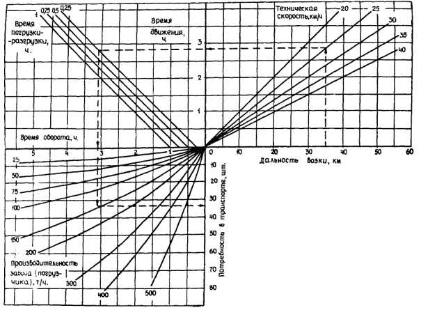 где N - число транспортных средств; Q - объем грузов, предназначенных к перевозке для обеспечения принятого темпа ведения работ, т (м3); Кв - планируемый коэффициент выпуска на линию соответствующих транспортных средств. Потребность в однотипных транспортных средствах, занятых на выполнении различных видов дорожно-строительных работ, суммируется по месяцам года, что определяет общую потребность в данном виде транспортных средств в конкретный период производства дорожно-строительных работ. Методика распределения транспортных средств (самосвалов) по видам перевозов приведена в приложении. 9.7. Равномерное распределение и загрузка транспортных средств в течение года обеспечиваются составлением сводных календарных графиков работы транспортных средств. 9.8. При составлении сводных календарных графиков работы транспортных средств необходимо: отдавать предпочтение массовым перевозкам дорожных смесей и дорожно-строительных материалов для устройства дорожной одежды; производить земляные работы в последовательности, обеспечивающей создание непрерывного задела по земляному полотну и оптимальное распределение транспортных средств между земляными работами и работами по сооружению дорожной одежды; переносить сроки перевозки грузов, не требующих строгой фиксации во времени, на те календарные периоды, когда потребность в транспортных средствах на основных работах, строго фиксированных во времени, снижается или становится минимальной. 9.9. К началу периодов максимальных, «пиковых», потребностей в транспортных средствах на основных видах дорожно-строительных работ, в первую очередь на работах по устройству дорожной одежды и во вторую очередь - на возведении земляного полотна, необходимо всемерно обеспечивать максимальную техническую готовность парка автомобилей-самосвалов; напротив, в периоды минимальных потребностей в транспорте можно увеличивать интенсивность работ по ремонту и техническому обслуживанию автомобилей, несколько уменьшая количество работающих автомобилей. 9.10. При определении количества автомобилей, обеспечивающих вывозку к местам укладки цементобетонных и цементогрунтовых смесей, не обязательно добиваться полного сохранения принятой расчетной производительности высокопроизводительного комплекта машин при максимальных дальностях транспортировки смесей. Она может быть несколько уменьшена в целях сокращения максимальной потребности в автомобилях. 9.11. Данные о производительности цементовозов и автогудронаторов, а также о потребности в автомобилях-самосвалах грузоподъемностью 12 т при устройстве дорожной одежды на дорогах I - II категории приведены в табл. 8 - 10. 9.12. При осуществлении массовых перевозок грузов с использованием значительных количеств транспортных средств, например при перевозке бетонной смеси с завода на трассу, необходимо предусмотреть последовательный выход автомобилей под погрузку строго по графику, не допуская одновременного появления на заводе в начале смены большого количества автомобилей, что предопределяет неизбежность длительного простоя их в ожидании погрузки. 9.13. Техническое обслуживание и ремонт должны проводиться в соответствии с «Положением о техническом обслуживания и ремонте подвижного состава автомобильного транспорта» (М., «Транспорт», 1972) и «Правила