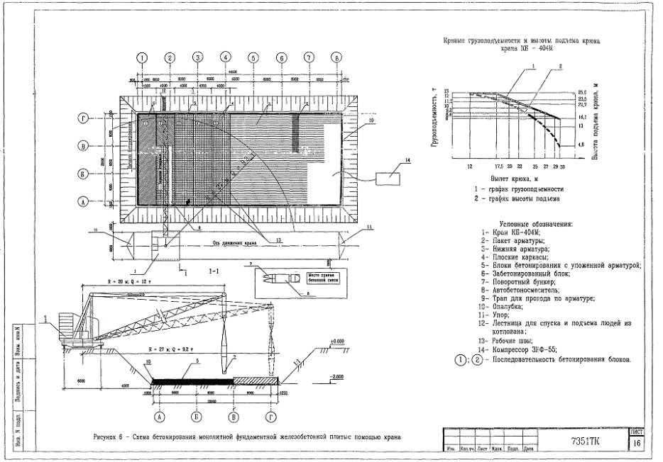 КАРТА 7351ТК Главный инженер __________ А.В. Колобов Исполнитель ____________ Е.А. Воинова 2002 Технологическая карта на устройство монолитной железобетонной фундаментной плиты содержит разделы: - область применения; - технология и организация выполнения работ; - требования к качеству и приемке работ; - требования техники безопасности и охраны труда, экологической и пожарной безопасности; - потребность в материально-технических ресурсах; - технико-экономические показатели. Технологическая карта предназначена для производителей работ, мастеров и бригадиров строительных организаций, работников технического надзора заказчика, а также инженерно-технических работников строительных и проектных организаций. В разработке технологической карты приняли участие: Воинова Е.А. - исполнитель и компьютерная обработка; Ярымов Ю.А. - главный инженер проекта; Бычковский Б.И. - корректура и нормоконтроль; к.т.н. Шахпаронов В.В. - научно-методическое руководство; к.т.н. Едличка С.Ю. - общее руководство. Технологическая карта не заменяет ППР (см. СНиП 3.01.01-85*) СОДЕРЖАНИЕ 1 ОБЛАСТЬ ПРИМЕНЕНИЯ1.1 Технологическая карта предназначена для применения при бетонировании монолитной фундаментной плиты на строительстве зданий и сооружений, при составлении проектов организации строительства и проектов производства работ для возведения объектов производственного и гражданского назначения. 1.2 В технологической карте предусмотрено вести работы по установке опалубки, арматуры и бетонированию фундаментной плиты при положительных температурах воздуха. При производстве работ в зимнее время года рекомендуется использовать технологические карты на производство монолитных бетонных работ при отрицательных температурах воздуха, разработанные ОАО ПКТИпромстрой в 1998 г. В качестве примера рассматривается устройство монолитной фундаментной плиты размерами в плане 44´20 м и толщиной 1 м (рисунок 1). 1.3 В технологической карте рассматриваются два варианта подачи бетонной смеси в конструкцию фундаментной плиты: - с применением автобетононасосов; - переносными бункерами емкостью 1 м3 с помощью крана. Рисунок 1 - Конструкция монолитной железобетонной плиты 1 - верхняя и нижняя арматура; 2 - плоские каркасы; 3 - пластмассовые фиксаторы. 1.4 Привязка технологической карты к конкретным объектам и условиям производства работ состоит в уточнении объемов работ, данных потребности в трудовых и материально-технических ресурсах. 2 ТЕХНОЛОГИЯ И ОРГАНИЗАЦИЯ ВЫПОЛНЕНИЯ РАБОТ2.1 Устройство монолитной железобетонной плиты следует осуществлять в соответствии с рабочими чертежами конструкции плиты с соблюдением правил производства и приемки работ согласно СНиП 3.03.01-87 «Несущие и ограждающие конструкции». 2.2 До начала производства работ по устройству фундаментной плиты должны быть выполнены следующие подготовительные работы: - устроены временные автодороги, подъезды и проезды; - возведены все необходимые временные здания и сооружения; - выполнены противопожарные мероприятия; - завезены на стройплощадку необходимые машины, механизмы, приспособления и оборудование, а также арматурная сталь и элементы опалубки; - разбиты, закреплены и приняты по акту оси сооружения и реперы (СНиП 3.01.03-84 «Геодезические работы в строительстве»); - оформлены все необходимые акты на скрытые работы (щебеночное основание,