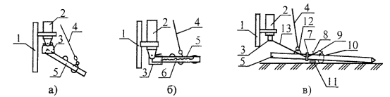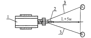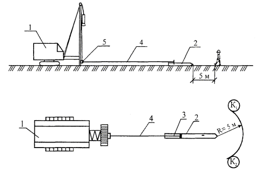 1 - мачта; 2 - молот; 3 - наголовник; 4 - свайный канат; 5 - свая; 6 - канатный петлевой соединитель; 7 - хомут (направляющая рамка); 8 - штырь фиксатор; 9 - подвеска с крюком; 10 - кольцевой строп; 11 - подкладка; 12 - петля; 13 - канаты подвески хомута. Рисунок 4 - Схема подъема (а) и установки (б) сваи шарнирно-закрепленным наголовником и схема специального устройства для одновременного подъема молота и сваи (в) 5.7 Зачаливание сваи за молот (кроме случаев, указанных в п. 5.6) и одновременный подъем сваи с молотом запрещаются. Подъем сваи осуществляется после полного подъема молота на необходимую высоту. 5.8 Разворачивать сваю после ее подъема в вертикальное положение и установки острием на грунт разрешается только с помощью специальных ключей. 5.9 Во избежание раскачивания и ударов сваи о конструкции копра во время ее подъема следует применять специальные оттяжки из пенькового каната. 5.10 В поднятом состоянии свая для безопасности установки ее на ось забивки во время поворота платформы копра (экскаватора) должна прикрепляться к нижней части копровой стрелы кольцевым стропом или механическими захватами. Эти механические захваты служат и для повышения точности при забивке сваи. 5.11 В процессе подъема сваи копровщик должен находиться на безопасном расстоянии от поднимаемой сваи. 5.12 Поднимать и опускать сваю следует плавно, без резких рывков и переключений механизмов копра, в том числе и с прямого хода на обратный. 5.13 Длина сваи должна быть не больше полезной высоты копровой стрелы, указанной в паспорте копра. 5.14 Организация рабочего места при подъеме и установке сваи в шарнирный наголовник копра (для свай до 6 метров) представлена на рисунке 5. Машинист установки устанавливает молот с прикрепленным к нему шарнирным наголовником на высоте 2 ... 2,5 м над землей. Свая поднимается свайным тросом в положение I, а копровщики К1 и К2 оттяжками заводят сваю в оголовник. Затем машинист установки опускает молот и свая самостоятельно одевается на наголовник, принимая положение II. Машинист выключает копровую установку. Копровщики К1 и К2 скрепляют сваю с крюками наголовника тросовым петлевым соединителем и снимают оттяжки. К1К2 - рабочие места копровщиков, L - длина сваи 1 - копровая установка, 2 - шарнирный наголовник, 3 - свая, 4 - оттяжка, 5 - свайный трос, 6 - тросовый петлевой соединитель, 7 - молот, 8 - копровая стрела Рисунок 5 - Схема организации рабочего места при подъеме и установке сваи в наголовник копра 5.15 Схема организации рабочего места при заводке сваи в оголовок копра представлена на рисунке 6. К1К2 - рабочие места копровщиков, L - длина сваи 1 - копровая установка, 2 - свая, 3 - кольцевой строп, 4 - оттяжки (пеньковый канат Æ 16 - 18 мм), 5 - хомут для закрепления оттяжек Рисунок 6 - Схема организации рабочего места при заводке сваи в оголовок копра После того, как свая подтянута к копровой установке на расстояние 1/3 своей длины, машинист копра останавливает установку, а копровщики производят перестроповку кольцевого стропа к карабину сваеподъемного троса. Копровщик К2 устанавливает предохранительные уголки на грани сваи, закрепляет оттяжки и отходит на безопасное расстояние (L + 5 м). Копровщик К1 отойдя на безопасное расстояние (L + 5 м), подает сигнал машинисту поднять сваю. Машинист копровой установки сваеподъемной лебедкой плавно поднимает дизель-молот со сваей, а копровщики К1 и К2 от