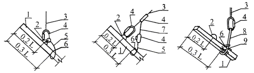 5.4 Подтаскивание копром свай, уложенных в штабель, лежащих на бровке котлована, а также зажатых другими изделиями (материалами) или примерзших не допускается. По специальному (письменному) разрешению главного инженера строительной организации может быть проведено стаскивание тросом копра (крана или базовой машины) металлических балок и труб с верхнего ряда штабеля при следующих условиях: - наличие свободного пространства около штабеля свай; - высота штабеля не должна превышать 1,2 м; - штабель после стаскивания с него очередной сваи сохраняет надежное положение лежащих в нем свай и обеспечивает безопасность работ по строповке следующей сваи; - участок, где расположен штабель, не имеет находящихся рядом других штабелей или сооружений, которые могут быть нарушены или деформированы стаскиваемой сваей; основание участка при стаскивании на него сваи не подвергается разрушениям, требующим восстановительного ремонта; - стаскивание свай производится только с использованием нижнего (отводного) блока, расположенного над уровнем земли не ниже 1 метра. Разрешение на стаскивание металлических балок и труб из штабеля может быть дано в следующих случаях: - прочность материала свай обеспечивает их недеформативность при сбрасывании со штабеля; - сбрасывание свай со штабеля является технологической операцией, предусмотренной проектом производства работ. Стаскивание (сбрасывание) железобетонных свай со штабеля категорически запрещается. 5.5 Организация рабочего места при подтаскивания сваи к копровой установке приведена на рисунке 2. При подтаскивании сваи копровщики К1 и К2 производят строповку сваи «мертвой» петлей кольцевым стропом канатного типа СКК, после чего отходят на безопасное расстояние и копровщик К1 подает сигнал машинисту подтянуть сваю к копру. Подтягивание осуществляется сваеподъемным тросом копра с помощью нижнего отводного блока, укрепленного на нижней части копровой стрелы. К1К2 - рабочие места копровщиков 1 - копровая установка, 2 - свая, 3 - строп канатного типа СКК1, 4 - трос сваебойного агрегата, 5 - отводной блок. Рисунок 2 - Схема организации рабочего места при подтаскивании свай. 5.6 Строповка сваи для подъема на копер и установки ее под молот перед погружением может производиться следующими способами: а) б) в) L - длина сваи; 1 - свая; 2 - подъемная петля; 3 - свайный канат; 4 - карабин; 5 - страховочный строп; 6 - штырь-фиксатор; 7 - двухветвевой строп; 8 - кольцевой строп; 9 - прокладки (деревянные). Рисунок 3 - Строповка свай длиной до 6 - 8 м (а, б) и более 6 - 8 м (в) при подъеме на копер а) за подъемную петлю (для свай длиной до 8 м) согласно рисункам 3а и 3б; 1) строповка производится непосредственно за петлю карабином свайного троса с запирающимся устройством и дополнительным страховочным стропом способом «на удавку», закрепленным у фиксирующего штыря; 2) строповка производится с помощью двухветвевого стропа, на концах каждой ветви которого закрепляются карабины. Карабин, расположенный на основной ветви, зацепляется за подъемную петлю сваи, а второй карабин удерживает петлю страховочного стропа, охватывающего сваю «на удавку», в месте расположения фиксирующего штыря. б) кольцевым стропом «на удавку» (для свай длиной более 8 м) согласно рисунку 3в; Строповка производится карабином свайного троса за кольцевой строп, охватывающий сваю «на уд