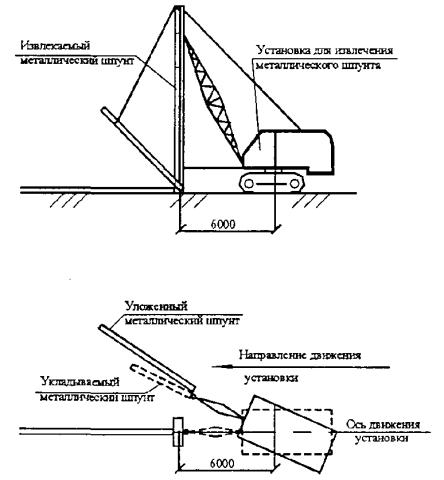 «Ларсен-Y» Площадь сечения 127,8 см2 Масса 1 м 100,0 кг «Ларсен-IY» Площадь сечения 94,3 см2 Масса 1 м 74,0 кг Рисунок 2 - Геометрические размеры шпунтов 2.12 Допускаемая местная кривизна профиля не должна превышать 10 мм на 1 м. Общая кривизна не должна превышать 0,6 % длины сваи. 2.13 На наружной поверхности шпунта, в торцах и в замковой части не должно быть трещин, закатов, плен и расслоений. Местные дефекты удаляют продольно-пологой вырубкой или зачисткой, причем в местах вырубки или зачистки размеры шпунта не должны выходить за пределы минимально допустимые. Поперечная вырубка или зачистка не допускаются. Допускаются без зачистки отдельные царапины, вмятины, раковины, мелкие плены, закаты и рябизна в пределах, допускаемых отклонений по размерам. 2.14 Трубы по длине изготавливаются: - немерной длины - в пределах от 4 до 12,5 м; - мерной длины - в пределах немерной; - длины, кратной мерной - в пределах немерной длины с припуском на каждый рез по 5 мм. По соглашению заказчика с изготовителем трубы изготавливают длиной, выходящей за пределы немерной длины. 2.15 Металлические трубы мерной длины и длины, кратной мерной, не должны иметь предельные отклонения по длине, превышающие +10 мм - при длине до 6 м; +15 мм - при длине свыше 6 м или с наружным диаметром более 152 мм. 2.16 Кривизна любого участка трубы на 1 м длины не должна превышать 1,5 мм - для труб с толщиной стенки до 20 мм; 2,0 мм - для труб с толщиной стенки свыше 20 до 30 мм; 4,0 мм - для труб с толщиной стенки свыше 30 мм. 2.17 По требованию потребителя трубы должны поставляться по внутреннему диаметру и по толщине стенки, а также по наружному и внутреннему диаметрам и по разностенности. Предельные отклонения по параметрам труб устанавливает ГОСТ 8732-78*, если таковые не установлены соглашением изготовителя с потребителем. 3 МАШИНЫ, ОБОРУДОВАНИЕ И ПРИСПОСОБЛЕНИЯ ДЛЯ ИЗВЛЕЧЕНИЯ ШПУНТА3.1 Извлечение шпунта из ограждения разрешается только после устройства фундаментов и обратной засыпки пазух котлована в строгом соответствии с технологической схемой и календарным графиком производства работ. 3.2 Шпунт следует извлекать с помощью специального оборудования, применение которого согласовано с Госгортехнадзором, способного развивать выдергивающие усилия в 1,5 раза превышающие усилия, определенные при пробном извлечении шпунта в данных или аналогичных условиях. Скорость подъема шпунта при их извлечении не должна превышать 3 м/мин в песках и 1 м/мин в глинистых грунтах. 3.3 В строительных организациях для извлечения металлического шпунта используют оборудование фирмы Крупп Хандель Гмох (ФРГ), в комплект которого входят: - вибратор марки MS-25H, представленный на рисунке 3; - дизельный приводной агрегат марки MS-A245, представленный на рисунке 4. Технические характеристики указанного оборудования представлены в таблицах 3 и 4. Импортное оборудование используют совместно с отечественным грузоподъемным механизмом, оборудованным опорной направляющей конструкции УМ-38. 3.4 Извлеченный металлический шпунт стропят с помощью карабина за специальную съемную монтажную петлю, устанавливаемую в вырезанное отверстие согласно рисункам 5, 6, а металлические трубы - кольцевым стропом СКК1 согласно рисунку 7. Поворотом стрелы шпунт переносят на специально отведенное место и укладывают согласно рисунку 8 для отбраковки. 3.5 При необходимости извлеченный шпунт