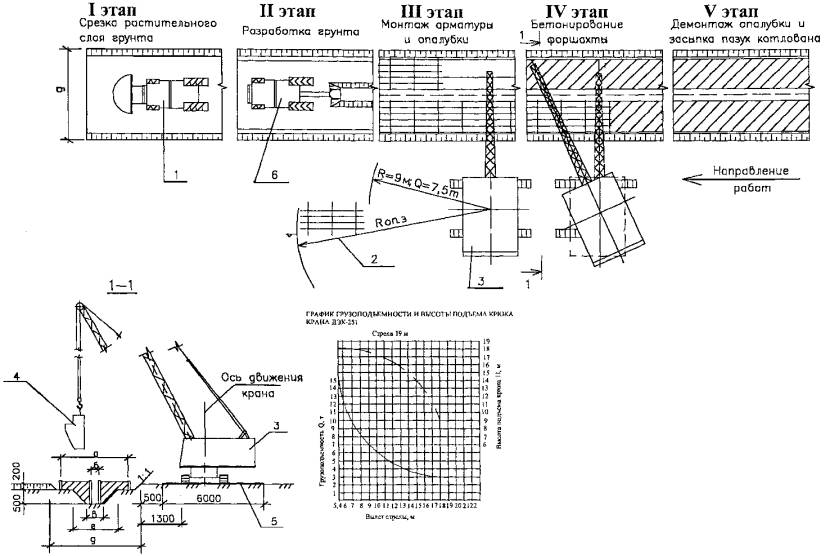 3.8 Для проведения операционного и приемочного контроля при соответствующем объеме работ могут быть рекомендованы посты контроля. 4 ТРЕБОВАНИЯ ТЕХНИКИ БЕЗОПАСНОСТИ И ОХРАНЫ ТРУДА, ЭКОЛОГИЧЕСКОЙ И ПОЖАРНОЙ БЕЗОПАСНОСТИ4.1 Работы по устройству форшахты должны выполняться под руководством ответственных руководителей работ (начальника участка, прораба, мастера), назначенных приказом. На них также возлагается ответственность за выполнение мероприятий по технике безопасности и промсанитарии, охране труда, экологической и пожарной безопасности. 4.2 На местах производства работ должны быть вывешены плакаты с графическим изображением схем строповки, а также таблица масс поднимаемых грузов и предельных вылетов стрелы крана. 4.3 На границах зон постоянно действующих и зон потенциально опасных производственных факторов должны быть установлены предохранительные защитные и сигнальные ограждения, а также знаки безопасности, хорошо видимые в любое время суток. Находиться в этих зонах посторонним лицам запрещается, а работа производится по наряду-допуску по форме приложения Д СНиП 12.03-99. Границы опасных зон (приложение Г СНиП 12-03-99) в местах, над которыми происходит перемещение грузов подъемными кранами, а также вблизи строящегося здания принимаются от крайней точки горизонтальной проекции наружного наибольшего габарита перемещаемого (падающего) предмета или стены здания с прибавлением наибольшего габаритного размера перемещаемого груза и минимального расстояния отлета груза при его падении и может быть выражено формулой: Rоп.з. = Rвылета + 1,5Lгр. + A, (1) где Rвылета - вылет стрелы, м Lгр. - горизонтальная проекция наружного наибольшего габарита перемещаемого груза (предмета); A - минимальное расстояние отлета перемещаемого груза (предмета) при его падении. 4.4 Не допускается дополнительная, не предусмотренная проектом нагрузка на грунт в пределах возможного клина обрушения. Переход людей через траншею должен допускаться только по специальным мосткам. 4.5 Экскаватор для работы должен устанавливаться на спланированной площадке. При его работе запрещается производить какие-либо работы и находиться людям в зоне вблизи движущихся частей и рабочих органов машины, ограниченной радиусом действия, увеличенным на 5 м. Погрузка грунта в автосамосвалы при помощи экскаватора должна производиться со стороны заднего или бокового борта. 4.6 Конструктивные элементы (дорожные плиты, арматурные каркасы и др.) во время перемещения должны удерживаться от раскачивания и вращения оттяжками из пенькового каната. При этом рабочим следует находиться вне контура устанавливаемого элемента (груза) со стороны, противоположной подаче их краном. Поданный элемент опускают над местом его установки не более чем на 0,3 м от проектной отметки, после чего рабочие наводят его на место установки. После опускания груза в проектное положение и его надежного закрепления разрешается снять строповочные приспособления и приступить к очередным операциям. 4.7 Пожарную безопасность на строительной площадке, участках работ и рабочих местах следует обеспечить в соответствии с требованиями «Правил пожарной безопасности в Российской Федерации» ППБ 01-93*. 4.8 Электробезопасность на строительной площадке, участках работ и рабочих местах должна обеспечиваться в соответствии с требо