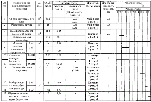 6 ТЕХНИКО-ЭКОНОМИЧЕСКИЕ ПОКАЗАТЕЛИ6.1 Затраты труда и машинного времени на устройство форшахты из монолитного железобетона подсчитаны по «Единым нормам и расценкам на строительные, монтажные и ремонтно-строительные работы», введенным в действие в 1987 г., и представлены в таблице 6. 6.2 Продолжительность работ на устройство форшахты из монолитного железобетона определяется календарным графиком работ согласно таблице 7. 6.3 Технико-экономические показатели составляют: - производительность в м изготовления форшахты за 1 смену - 6,15 - трудозатраты на 10 м форшахты - 45 чел.-ч. - затраты машинного времени - 2,7 маш.-ч. - сроки выполнения - 13 час. Таблица 6 - Калькуляция затрат труда и машинного времени Измеритель конечной продукции - 10 м форшахты