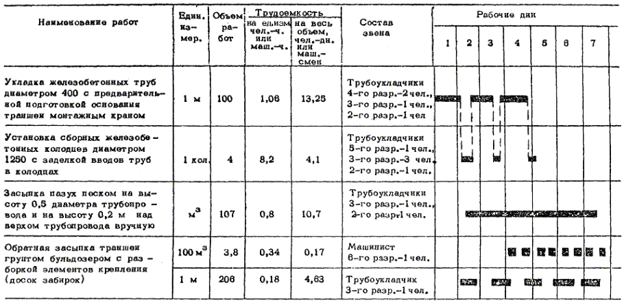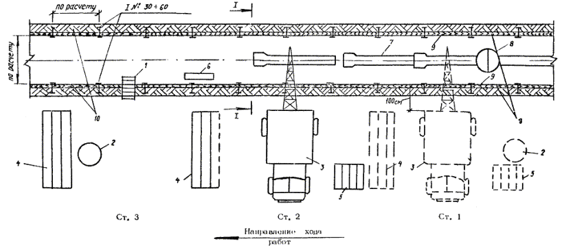1. Область применения1.1. Технологическая карта составлена на производство работ по прокладке подземных коммуникаций (канализация, водопровод, водосток и др.) в траншеях с креплениями на объектах Главмосстроя. 1.2. Технологическая карта предназначена для составления проектов производства работ и с целью ознакомления (обучения) рабочих и инженерно-технических работников с правилами производства работ. 1.3. При привязке технологической карты к конкретному объекту и условиям строительства уточняются схемы производства работ, объемы работ, калькуляция затрат труда, средства механизации. 2. Технология строительного процесса2.1. При прокладке подземных коммуникаций в траншеях с креплениями необходимо руководствоваться СНиП III-8-76 «Земляные сооружения», СНиП III-30-74 «Водоснабжение, канализация и теплоснабжение. Наружные сети и сооружения» и др. 2.2. Прокладка подземных коммуникаций в траншеях с консольными креплениями. До начала работ должна быть проверена устойчивость крепления стен траншеи и составлен акт на право производства работ и допуска рабочих в траншею. К началу работ на стройплощадку должны быть завезены все необходимые материалы и изделия (трубы, железобетонные колодцы и др.), доставлены необходимые машины и оборудование. Прокладку труб необходимо выполнять в следующей последовательности: геодезическая разбивка оси трубопровода; подготовка основания траншеи; укладка труб; установка железобетонных колодцев; заделка вводов труб в колодцах; присыпка трубопроводов грунтом; гидравлическое испытание трубопроводов (при необходимости); окончательная засыпка траншеи; извлечение из грунта элементов креплений траншеи (двутавровые балки, металлические трубы, шпунт Ларсена и др.). Схемы организации работ приведены на листах 1 и 2. 2.3. Прокладка подземных коммуникаций в траншеях с распорными креплениями производится в такой же последовательности, как указано выше, но со следующим добавлением: распорки креплений, мешающие монтажу труб, в процессе работ переставляются. Схемы организации работ приведены на листах 3 и 4. 2.4. Схемы организации работ при прокладке пластмассовых труб в траншеях с креплениями и соединение их на сварка приведены на листах 5, 6; 7. 2.5. Засыпка траншей с уложенными трубопроводами должна производиться в два приема: 1) сначала мягкими грунтами (песчаным, глинистым, за исключением твердых глин, природными песчаногравийными слоями без крупных включений) засыпаются и подбиваются приямки и пазухи одновременно с обеих сторон, а затем траншея засыпается указанным грунтом на 0,2 выше верха труб с обеспечением сохранности труб, стыков и изоляции; при этом грунт отсыпается слоями и уплотняется ручными и навесными электротрамбовками, для трубопроводов из керамических, асбестоцементных и полиэтиленовых труб высота слоя засыпки грунта над трубой должна быть 0,5 м; 2) последующая засыпка траншеи производится после испытания трубопроводов любым грунтом без крупных включений (200 и > мм) механизированным способом; при этом должна обеспечиваться сохранность труб. 2.6. Разборку элементов крепления стен траншеи производить в направлении снизу вверх по мере обратной засыпки грунтом. 2.7. После извлечения металлических труб из грунта оставшиеся скважины засыпать грунтом на всю высоту. 2.8. При работе с пластмассовыми трубами необ