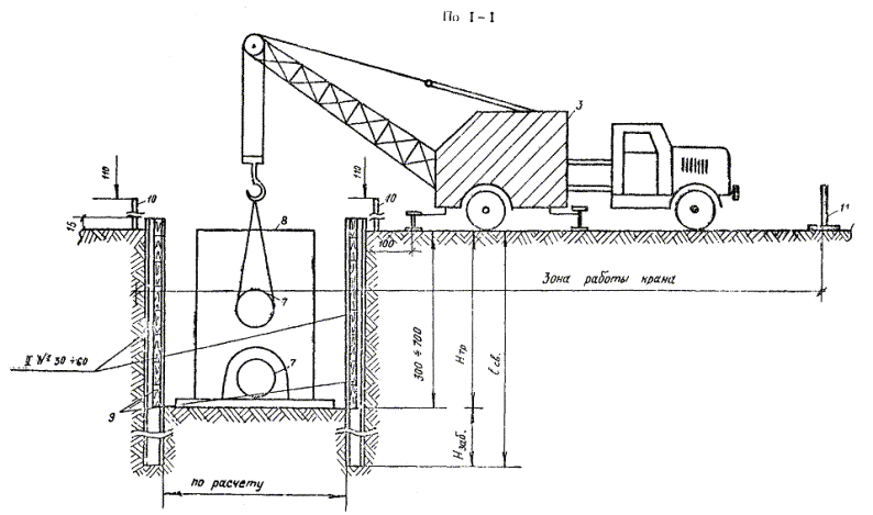 Условные обозначения: 3 - монтажный кран; 7 - железобетонная труба; 8 - железобетонный колодец; 9 - забирка из досок; 10 - временное ограждение; 11 - ограждение высотой 100 см Читать совместно с листом 1 СХЕМА ОРГАНИЗАЦИИ РАБОТ Лист 3 (при прокладке канализации, водостока, водопровода и пр.) Крепление стен траншеи с распорками