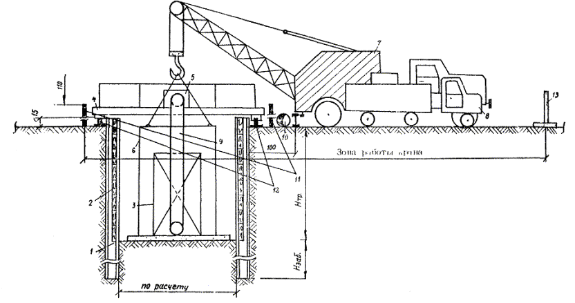 Условные обозначения: 1 - лестница для спуска рабочих в траншею; 2 - места складирования железобетонных колодцев; 3 - монтажный кран; 4 - места складирования труб; 5 - распорки креплений стен траншеи; 6 - ящики-контейнеры для бетона (раствора); 7 - ящик для инструмента; 8 - забирки из досок; 9 - металлические трубы диаметром 219 мм; 10 - пояса из двутавровых балок № 30 ¸ 60; 11 - железобетонный колодец; 12 - временное ограждение высотой 110 см; 13 - уложенные железобетонные трубы; Читать совместно с листом 4. Примечание: Допуск рабочих в траншею разрешается после приемки устойчивости крепления стен траншеи. СХЕМА ОРГАНИЗАЦИИ РАБОТ Лист 4 Крепление стен траншеи с распорками