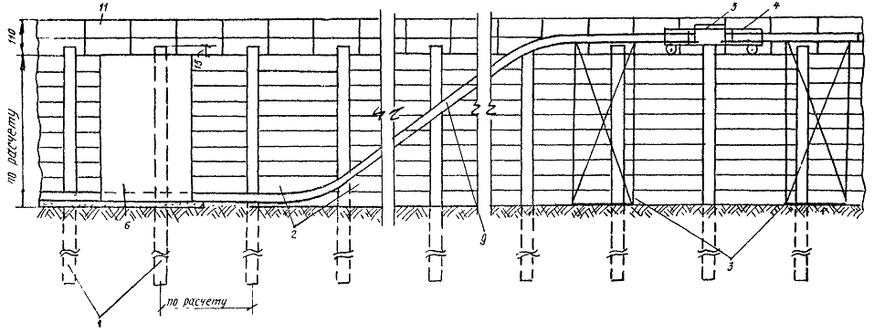 Условные обозначения: 1 - двутавровые балки № 30 ¸ 80; 2 - забирки из досок; 3 - опорные стойки; 4 - передвижная платформа; 5 - установка для сварки; 6 - железобетонный колодец; 7 - монтажный кран; 8 - автомашина; 9 - лестница для спуска рабочих в траншею; 10 - пластмассовые трубы, сваренные в плеть; 11 - раскладка пластмассовых труб на бровке траншеи Примечания. 1. Допуск рабочих в траншею разрешается после приемки устойчивости крепления стен траншеи. 2. Траншея должна быть ограждена, как показано на листах 1 и 2. 3. Разрезы III - III, IV - IV показаны на листах 6, 7. СХЕМА ОРГАНИЗАЦИИ РАБОТ Лист 6 Крепление стен траншеи консольное По III - III