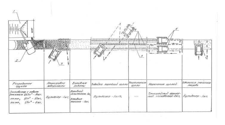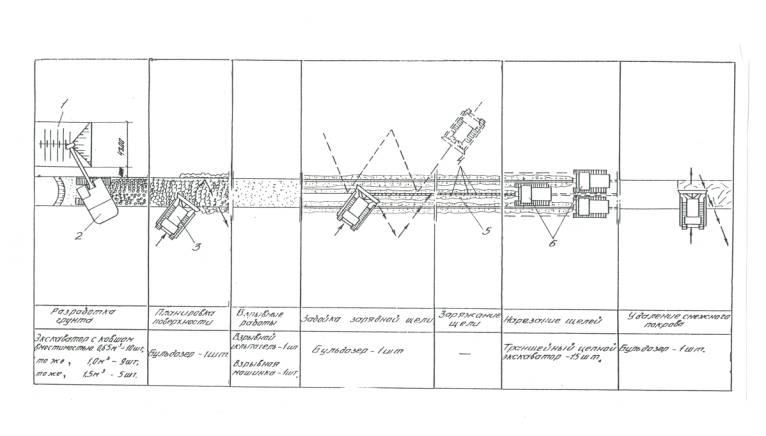 4 - заряды ВВ; 5 - детонирующий шнур; 6 - траншейный фрезерный экскаватор