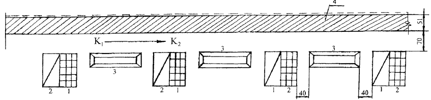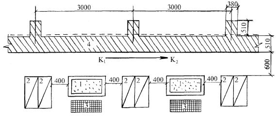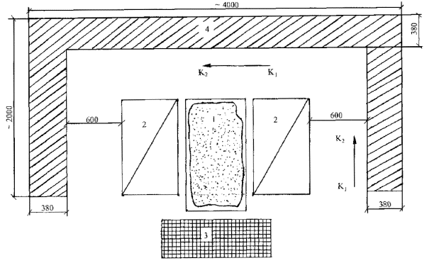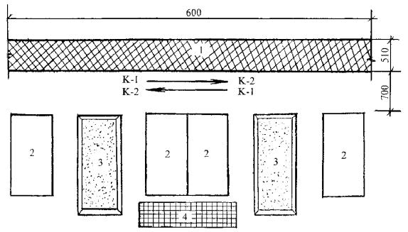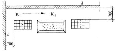 Условные обозначения: 1. Ящик с раствором 2. Поддоны с кирпичом 3. Арматурная сетка 4. Выкладываемый участок стены К1, К2 - рабочее место каменщиков