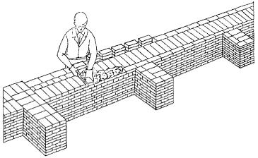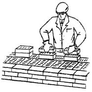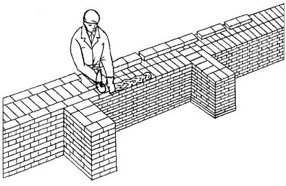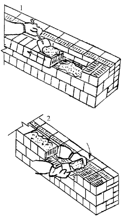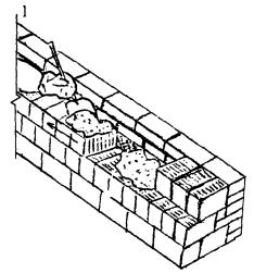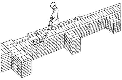 3 Подача и раскладка семищелевых керамических камней, перемешивание, подача и разравнивание раствора для кладки забутки Для кладки забутки: а) тычками - каменщик К-2 раскладывает камни насухо по внутренней версте стены вплотную один к другому, перпендикулярно оси стены, затем лопатой разравнивает грядку раствора между наружной и внутренней верстами, другую грядку раствора разравнивает на внутренней версте; б) ложками - каменщик К-2 раскладывает камни ложками на внутренней половине стены, раскладывая их щелями вверх, параллельно оси стены и разравнивает грядку раствора на стене под забутку.