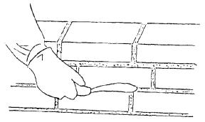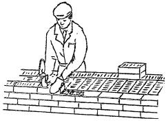 Держа в правой руке кельму, каменщик К-1 разравнивает ею растворную постель, затем ребром кельмы подгребает часть раствора и прижимает его к вертикальной грани ранее уложенного кирпича, а левой рукой подает новый кирпич к месту укладки. После этого кладет кирпич на подготовленную постель и, двигая его левой рукой к ранее уложенному кирпичу, прижимает к полотну кельмы. Движением вверх правой руки вынимает кельму, а кирпичом, придвигаемым левой рукой, зажимает раствор между вертикальными гранями укладываемого и ранее уложенного кирпича. Нажимом руки осаживает уложенный кирпич на растворной постели. Избыток раствора, выжатый из шва на лицо кладки, подрезает кельмой за один прием после укладки ложками двух кирпичей; подрезанный раствор каменщик К-2 набрасывает на растворную постель. 5.4 Расшивка швов После того, как каменщик К-1 выложит 2 ряда кладки, каменщик К-2 приступает к расшивке сначала вертикальных, а затем горизонтальных швов с наружной стороны, одновременно протирая поверхность перегородки ветошью.