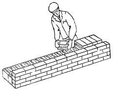2 Кладка наружной версты Каменщик К-1 кельмой разравнивает растворную постель и подгребает часть раствора к вертикальной грани ранее уложенного кирпича, а левой рукой подает следующий кирпич к месту укладки, кладет на подготовленную постель и прижимает к полотну кельмы. Движением вверх (правой руки) вынимает кельму, а кирпичом зажимает раствор между вертикальными гранями укладываемого и ранее уложенного кирпича, осаживая нажимом руки. Избыток раствора подрезает кельмой и набрасывает на растворную постель. Таким же образом каменщик К-1 кладет второй ряд наружной версты.