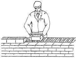 5.2 Распределение раствора для кладки кирпича наружной версты тычкового ряда Каменщик К-2 из ящика совковой лопатой подает раствор и распределяет его грядкой на длину 120 - 150 см, отступив 1,5 - 2 см от края стены.