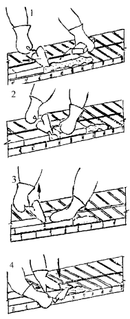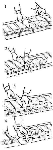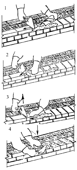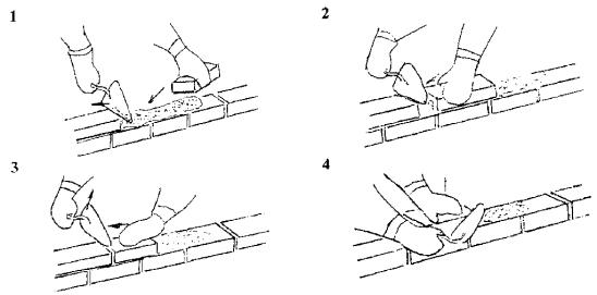 5 Приемы труда 5.1 Кладка наружной версты (ложковый ряд) Кладка ведется способом «вприжим». Держа в правой руке кельму, каменщик К-1 разравнивает ею растворную постель, затем ребром кельмы подгребает часть раствора и прижимает его к вертикальной грани ранее уложенного кирпича, а левой рукой подносит новый кирпич к месту укладки (поз. 1). После этого кладет кирпич на подготовленную постель и, двигая его левой рукой к ранее уложенному, прижимает к полотну кельмы (поз. 2). Движением правой руки вверх каменщик вынимает кельму, а кирпичом, перемещаемым левой рукой, зажимает раствор между вертикальными гранями укладываемого и ранее уложенного кирпича (поз. 3). Легким постукиванием ребром кельмы осаживает уложенный кирпич на растворной постели. А. Кладка ложкового ряда наружной версты Избыток раствора, выжатый из шва на лицевую поверхность кладки, каменщик К-1 подрезает кельмой за один прием после укладки двух кирпичей (поз. 4).