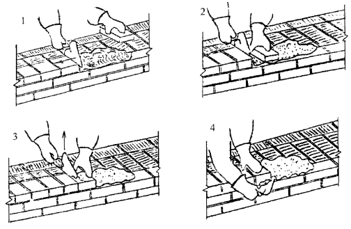 Кладка ведется способом «вприжим». Держа в правой руке кельму, каменщик К-2 разравнивает ею растворную постель, затем ребром кельмы подгребает часть раствора и прижимает его к вертикальной грани ранее уложенного кирпича, а левой рукой подносит новый кирпич к месту укладки (поз. 1). После этого кладет кирпич на подготовленную постель и, двигая его левой рукой к ранее уложенному, прижимает к полотну кельмы (поз. 2). Движением правой руки вверх каменщик вынимает кельму, а кирпичом, придвигаемым левой рукой, зажимает раствор между вертикальными гранями укладываемого и ранее уложенного кирпича (поз. 3). Легким постукиванием ребром кельмы осаживает кирпич на растворной постели. При кладке под штукатурку избыток раствора, выжатый из шва на лицо кладки, подрезает кельмой за один прием после укладки четырех-пяти кирпичей (поз. 4). 5.4 Укладка арматурной сетки Каменщик К-1 на выложенный тычковый ряд наносит раствор толщиной 2 мм, затем укладывает сетки так, чтобы концы стержней сетки выступали на 2 - 3 мм за внутреннюю поверхность стены. Концы стержней сеток связывают между собой проволокой. Общая толщина шва не должна превышать 16 мм.