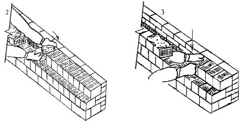 Каменщик К-2 подает раствор на стену под внутреннюю версту и на разложенные камни (поз. 1). Каменщик К-1 разравнивает раствор кельмой, затем он берет камень обеими руками за торцовые грани (поз. 2), поднимает его и подносит к месту укладки, постепенно поворачивая так, чтобы его грань с раствором заняла вертикальное положение. Окончательный поворот камня каменщик осуществляет в момент осаживания камня на постель. Укладывая камень на место, каменщик К-1 передвигает левую руку вверх по тычковой грани для того, чтобы его пальцы не оказались зажаты между камнями наружной и внутренней верст, затем он плотно прижимает укладываемый камень к ранее уложенным (поз. 3) и осаживает его нажимом руки.