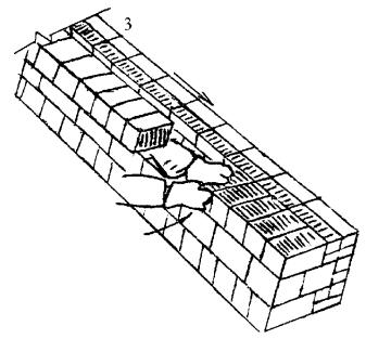 5.2 Кладка забутки Каменщик К-2 лопатой разравнивает грядку раствора для образования постели между наружной верстой кладки и разложенными камнями. Другую грядку раствора каменщик К-2 накладывает на разложенные камни (поз. 1). Каменщик К-1 разравнивает раствор кельмой, затем он берет обеими руками за торцовые грани камня и подносит его к месту укладки, постепенно поворачивая его так, чтобы его грань с раствором заняла вертикальное положение (поз. 2). Чтобы раствор не сползал, окончательный поворот камня каменщик К-1 осуществляет в момент осаживания камня на постель. Укладывая камень на место, каменщик передвигает левую руку вверх по тычковой грани, затем он плотно прижимает укладываемый камень к ранее уложенным (поз. 3) и осаживает его нажимом руки.