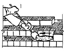 5.2 Распределение раствора и кладка тычкового ряда наружной версты Каменщик К-2 совковой лопатой подает раствор и распределяет его грядкой на длину 80 - 100 см, отступив 1,5 - 2 см от края стены. Каменщик К-1 разравнивает растворную постель кельмой на длину 40 - 50 см, подгребает часть раствора к ложковой грани ранее уложенного кирпича и, прижимая укладываемый кирпич к полотну кельмы, вынимает ее, осаживает кирпич нажимом руки. Избыток раствора подрезает кельмой и сбрасывает на кладку.