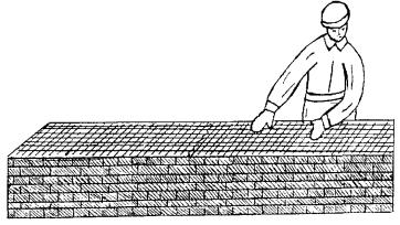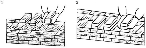 4.4 Приемы труда 1 Подача и раскладка керамического кирпича, перемешивание, подача и разравнивание раствора для кладки наружной версты Каменщик (К-2) раскладывает кирпичи после его подачи на внутренней половине стены: - для кладки ложковых рядов - стопками по два кирпича параллельно оси стены или под углом 45° к ней с расстоянием между стопками в один кирпич; - для кладки тычковых рядов - стопками по два кирпича перпендикулярно оси стены с расстоянием между стопками в полкирпича или под углом 45° к оси стены. Каменщик К-2 разравнивает раствор, отступив от лица стены на 10 - 15 мм под ложковые ряды на ширину 70 - 80 мм через боковую грань лопаты, а под тычковые ряды - через ее передний край шириной 200 - 220 мм; растворную грядку разравнивает тыльной стороной лопаты.