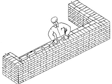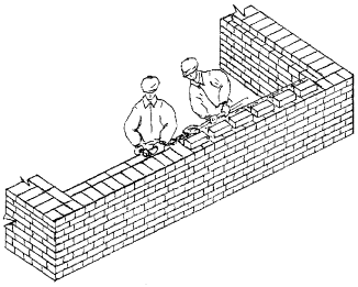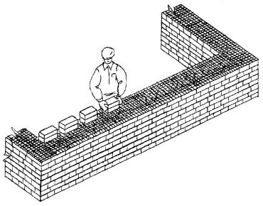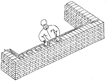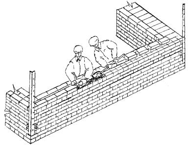 3 Подготовка трудового процесса и условия его выполнения 3.1 До начала трудового процесса необходимо: - убрать мусор и посторонние предметы с рабочего места; - проверить уровнем горизонтальность основания под стену; - разбить фронт работ на захватки и делянки; - нанести осевые риски для кладки стены; - установить при необходимости средства подмащивания; - расположить материал, инструмент, приспособления и инвентарь согласно «Организации рабочего места». 3.2 Работы следует выполнять, соблюдая требования техники безопасности и охраны труда рабочих в соответствии со СНиП 12-03-2001 и СНиП III-4-80*, и правил производства и приемки работ согласно СНиП 3.03.01-87. 4 Технология и организация трудового процесса 4.1 Кладку простых внутренних кирпичных стен толщиной 51 см под штукатурку выполняет звено из двух каменщиков. Кладку начинают с закрепления угловых и промежуточных порядовок, которые устанавливают с помощью отвеса и уровня или нивелира по периметру стен на расстоянии 10 - 15 м друг от друга. По порядовкам выкладывают маяки по углам стен в виде убежной штрабы. Укрепляют причалку у маяков с помощью скобы. Чтобы причалка не провисала между маяками, под шнур подкладывают маячный клин, толщина которого равна высоте ряда кладки. Кладка ведется по однорядной системе перевязки способом «вприжим». Арматурные сетки из стали класса А-II диаметром 5 мм с ячейками 5´5 см, размером 0,48´1,6 м укладываются через 6 - 8 рядов. Качество лицевой поверхности проверяют правилом, вертикальность и горизонтальность с помощью отвеса и уровня. 4.2 Операции по кладке внутренних кирпичных стен толщиной 51 см с армированием под штукатурку выполняются в следующем порядке: - установка порядовки и натягивание причального шнура; - подача и раскладка кирпича; - перемещение, подача и разравнивание раствора; - кладка наружной и внутренней версты тычковых рядов; - укладка арматурной сетки; - кладка наружной версты, забутки и внутренней версты ложковых рядов; - проверка качества кладки. 4.3 Организация рабочего места