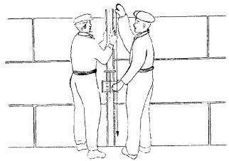 5 Приемы труда 5.1 Натягивание причального шнура Каменщики К-1 и К-2 укрепляют у маяков причалку с помощью скобы, острый конец которой вставляется в шов кладки, а к тупому более длинному концу привязывают причалку. При этом одна из скоб вставляется в шов угловой убежной штрабы, а другая скоба - в шов убежной штрабы ранее выложенной наружной стены. Поворотом скобы в новое положение получают линию натяжения причалки для следующего ряда и так до четвертого ряда кладки. Затем скобу переставляют.