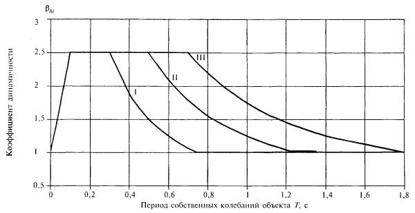 где hi - толщина i-го слоя неоднородной расчетной толщи грунта; Кгр,i - коэффициент, учитывающий сейсмические свойства i-го слоя грунта. 3.22. Условное сопротивление сжатию песчаных и глинистых грунтов находят по приложению 2 в зависимости от показателей их физических свойств (гранулометрического состава, влажности и плотности для песчаных грунтов, числа пластичности Ip, коэффициента пористости е и показателя консистенции JL для глинистых грунтов). 3.23. Нормальная спектральная характеристика горизонтальных колебаний грунта определяется по табл. 3.1 в зависимости от его категории по сейсмическим свойствам. Рекомендуемые графики спектров показаны на рис. 3.1. Спектральная характеристика bhi может быть уточнена на основании анализа сейсмограмм, записанных временной сетью регистрации землетрясений на участке строительства. Таблица 3.1