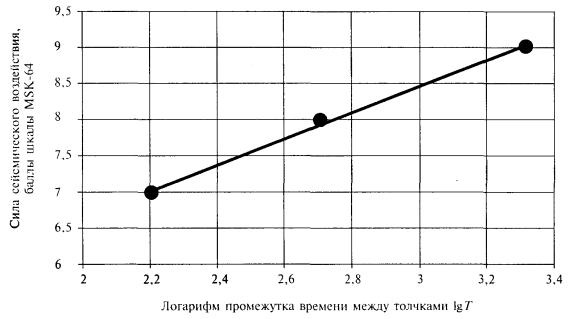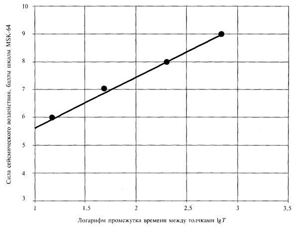 Данные таблицы показывают, что расчетные значения среднего интервала времени между землетрясениями, как правило, отличаются от нормативной величины 1000 лет, регламентированной для проектирования сооружений повышенной ответственности. Причем в одних пунктах (Чара, Чина, Горячий Ключ и др.) расчетная частота сейсмических событий оказывается больше, а в других пунктах (Мацеста, Иркутск, Владикавказ и др.) - существенно меньше нормативной. Таким образом, вариации сейсмического режима по площади сейсмических районов не позволяют обеспечить одинаковую сейсмостойкость объектов одного класса ответственности без специальных исследований этого фактора и учета его при проектировании сооружений. Для приведения параметров расчетного сейсмического воздействия к предписанной нормами частоте расчетных событий при проектировании транспортных сооружений применяется разработанная авторами процедура. На первом этапе работы с привлечением сейсмологов расчетным путем определяют средние промежутки времени Ti между сейсмическими сотрясениями разной силы Ii применительно к относительно ровным участкам местности, сложенным грунтами со средними сейсмическими свойствами. Затем по найденным парам чисел (Ii, Ti), с использованием известных приемов обработки экспериментальных данных, находят коэффициенты корреляционного уравнения логарифмического типа I = а + blgT. Полученная таким образом зависимость позволяет найти уточненную силу землетрясения I, соответствующую заданному промежутку времени Т = 1000 лет между толчками расчетной силы или вероятности 95 % непревышения расчетного сейсмического воздействия за 50 лет эксплуатации сооружения. В общем случае уточненная сила землетрясения отличается от сейсмичности района по карте ОСР-97-В на положительную или отрицательную величину DI. Рассмотрим уточнение сейсмичности на примере створа предполагаемого транспортного перехода через пролив Невельского. Согласно расчетам промежутки времени между землетрясениями силой 7, 8 и 9 баллов по шкале MSK-64 составляют Т7 = 70 лет, T8 = 350 лет и Т9 = 2500 лет. Соотношение между десятичным логарифмом промежутка времени Т и силой толчка в баллах I можно приближенно представить в виде показанной на графике корреляционной зависимости I = 1,36lgT + 4,50. Подставляя в найденное уравнение сейсмического режима значение интервала времени 1000 лет, находим уточненную сейсмичность створа транспортного перехода I = 8,6 балла. Уточненная сейсмичность относится к участкам, сложенным средними по сейсмическим свойствам грунтами.