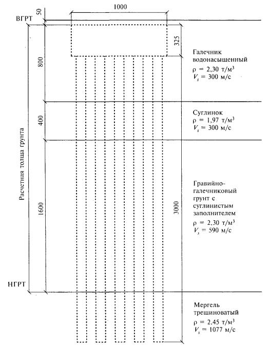 В пределах Рача-Лечхумской зоны ВОЗ в 1991 г. произошло одно из сильнейших землетрясений Кавказа (Рачинское), магнитуда главного толчка которого достигла 6,9, глубина центра очага находилась в пределах от 6 до 14 км. При землетрясении в плейстосейстовой зоне появились многочисленные поверхностные деформации грунтов в основном сейсмогравитационного происхождения, общие и местные деформации дорожных сооружений. По данным В.И. Уломова, район Рокского перевала характеризуется высокой сейсмической активностью. Средние интервалы времени между землетрясениями силой от 6 до 9 баллов по шкале MSK-64 для средних грунтовых условий составляют: 6 баллов - 13 лет, 7 баллов - 48 лет, 8 баллов - 200 лет, 9 баллов - 1000 лет. Галереи на автомобильных дорогах категории II относятся к объектам повышенной ответственности. При определении сейсмичности района строительства таких сооружений исходят из тысячелетнего среднего интервала времени между землетрясениями, т.е. в данном случае в качестве исходной сейсмичности следует принять силу землетрясения 9 баллов по шкале MSK-64. Для землетрясения силой 9 баллов нормальные амплитудные характеристики колебаний среднего по сейсмическим свойствам грунта принимаются: ускорения - 400 см/с2, скорости - 32,0 см/с, перемещения - 16,0 см. К этим характеристикам следует ввести коэффициент на местные грунтовые условия. Инженерно-геологические исследования на участке строительства галереи выполнены специалистами центра «Технориск» МГУ им. М.В. Ломоносова. Ими получены данные о залегании грунтов и их свойствах в разрезах, ориентированных вдоль оси дороги. Массив грунтов в основании галереи включает три основных слоя: 1) насыпной грунт, состоящий из гравия и щебня аргиллита, алевролита, песчаника и известняка с большим содержанием супесчано-суглинистого заполнителя; 2) делювиально-эллювиальные отложения, переходящие в сильно трещиноватые известняки, песчаники, мергели; 3) плотные скальные грунты ниже зоны интенсивного выветривания. На расстоянии 20 - 30 м от горного склона насыпной слой имеет мощность от 8 до 11 м, зона интенсивного выветривания распространяется до глубины 19 - 20 м от поверхности земляного полотна, ниже залегают плотные трещиноватые скальные грунты. По данным изысканий, плотность слоев равна: r1 = 1,95 т/м3 - для насыпного грунта, r2 = 2,35 т/м3 - для разрушенной скалы, r3 = 2,4 т/м3 - для плотной скальной породы. Мощность насыпных грунтов из делювиальных отложений уменьшается по направлению от кромки полунасыпи к горному склону. В среднем по ширине основной площадки земляного полотна мощность изученных слоев основания равна: для гравийно-щебенистого грунта - 3,8 м, для сильно выветрелой скалы - 10 м, для нижележащей плотной коренной породы - 13,2 м. Скорости продольных и поперечных сейсмических волн в грунтах определены с помощью цифровой станции «Диоген». Для упомянутых слоев получены следующие значения скорости волн: для первого слоя Vр = 525 м/с, Vs = 275 м/с; для второго слоя Vp = 1125 м/с, Vs = 485 м/с; для третьего слоя Vp = 1825 м/с, Vs = 800 м/с. Сейсмичность участка строительства галереи устанавливается в зависимости от сейсмических свойств грунта расчетной толщи мощностью 10 м, расположенной ниже отметок заложения фундаментов. В состав расчетной толщи входят слой гравийно-щебенистого грунта мощностью h1 = 2,6 м и слой выветрелой скальной породы мощностью h2 = 7