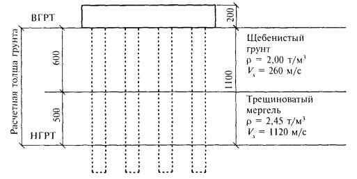 Фундамент опоры № 9 запроектирован в виде высокого свайного ростверка. Оголовок фундамента состоит из двух ступеней. Нижняя ступень выполнена в форме прямоугольной плиты с размерами в плане 8,6´12,2 м. Верхняя ступень имеет наклонные боковые грани, т.е. имеет форму усеченной пирамиды. Оголовок фундамента опирается на четыре ряда буронабивных свай диаметром 0,72 м по семь свай в каждом ряду. Длина свай ниже подошвы плиты 14,0 м, длина обсадных труб - 12,5 м. С поверхности площадка строительства опоры № 9 сложена щебнем, дресвой и глыбами мергеля. Содержание заполнителя (полутвердой глины) составляет 30 - 50 %. По оси опоры мощность крупнообломочных отложений - примерно 6,0 м. ВГРТ принимаем в уровне низа фундаментной плиты, так как самый верхний слой щебня удаляется при планировке строительной площадки. Щебенистый грунт залегает на крутопадающей к дну долины кровле трещиноватого мергеля выветрелого до глубины 7,0 м от его поверхности. Зона разбитого на блоки массива имеет мощность от 3 до 7 м. Ниже этой зоны мергель залегает в виде сплошного массива (рис. 5.3). В данном случае особенность инженерно-геологических условий заключается в малой мощности (менее 10 м) слоя щебенистых отложений. Поэтому в состав расчетной толщи нужно включить часть массива трещиноватого мергеля с тем, чтобы общая мощность толщи была не менее 10 м. Исходя из физических соображений в расчетную толщу включаем слой выветривания мощностью 5 м. Таким образом, расчетная толща состоит из двух слоев. Для верхнего слоя (щебенистого грунта) принимаем r1 = 2,0 т/м3, Vs1 = 260 м/с, r1Vs1 = 2,0×260 = 520 т/м2×с. Для нижнего слоя (трещиноватый мергель) эти характеристики будут: r2 = 2,45 т/м3, Vs2 = 1120 м/с, r2Vs2 = 2,45×1120 = 2744 т/м2×с. Средневзвешенная сейсмическая жесткость основания опоры