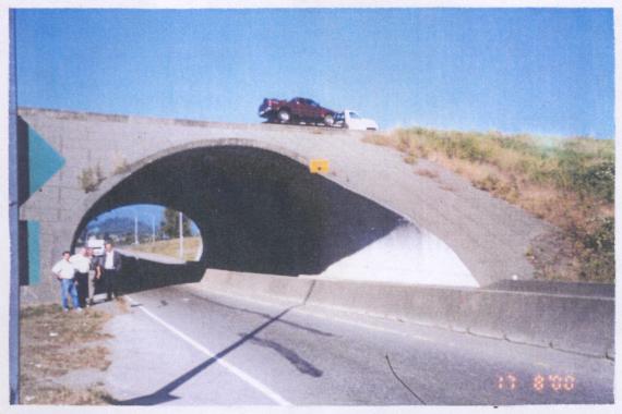 грунта в верхней части склонов и на плоской горизонтальной площадке вне долины Принимаем, что искомый коэффициент Кр.м изменяется линейно между найденными значениями 0,73 (на дне долины) и 1,13 (на отметке верха бортов долины). Тогда для отметки площадки строительства галереи Кр.м = 0,91. Для меньших значений периода волны 0,2 и 0,1 с коэффициент Кр.м несколько уменьшается (до 0,88 и 0,86 соответственно). Расчет галереи, подпорной стены и прилегающего массива грунта выполнен по сейсмограмме с максимальным ускорением горизонтальных колебаний 460 см/с2. Расчет потребовал выполнения значительного объема вычислений для учета взаимодействия оболочки с массивом окружающего грунта. Время расчета одного варианта с учетом сейсмического воздействия составило 150 маш.-ч работы компьютера, используемого для решения сложных научных задач. На сейсмическое воздействие галерея рассчитывалась специалистами фирмы «Остсейсм» с учетом взаимодействия стальной оболочки с грунтом засыпки, подпорной стеной, основанием полки и верховым откосом выемки. Грунтовый массив рассматривался состоящим из трех типов грунта (грунт основания, засыпки и заполнения габионов). Конечно-элементная модель грунтового массива принята с использованием плоских четырехугольных элементов, входящих в стандартную библиотеку конечных элементов программы «Ansys». При выполнении расчетов учитывались неупругие деформации грунта. Свод галереи рассматривался как тонкая упругая оболочка. Граничные условия по краям оболочки задавались в виде шарнирного опирания, т.е. исключались перемещения краев свода относительно фундаментов, но допускались повороты в граничных узлах модели. Последнее предположение является спорным, поскольку гофрированные листы по проекту должны заделываться сваркой опорных пластин и заложенных в фундаментные блоки швеллеров с последующим заполнением бетоном узлов объединения нижних гофрированных листов арки с фундаментными блоками. Следует отметить также, что в расчетной схеме не учитывалась возможность отрыва грунта засыпки от поверхности верхового откоса. Для обеспечения совместности деформаций верхового откоса и грунта засыпки при сейсмическом воздействии необходимо в скальный откос заложить горизонтальные анкеры с достаточным выпуском их в массив насыпного грунта, армированного геосетками. В противном случае в результате отрыва засыпки от верхового откоса сильно возрастут горизонтальные перемещения в системе насыпной грунт - галерея - подпорная стенка и напряжения в своде. 4.3. Работы по СМР для галереи в Северной Осетии Наиболее крупное дорожное сооружение из гофрированных стальных элементов на территории нашей страны - лавинозащитная галерея в Северной Осетии, построенная вблизи от Рокского перевала в 2002 г. (фото 5 прилож. 4). Галерея запроектирована в виде полуциркульной арки радиусом 5,55 м, собираемой из сегментов с размерами гофра 400´150 мм при толщине листов 7 мм. Опорные сегменты заделаны в монолитные ленточные фундаменты из железобетона. Глубина заложения подошвы фундаментов 1,2 м (рис. 4.2). Рис. 4.2. Лавинозащитная галерея вблизи Рокского перевала После монтажа конструкция обсыпалась дренирующим грунтом с послойным уплотнением последнего виброкатком. Поверх уплотненной засыпки отсыпался щебень, непосредственно воспринимающий удары лав