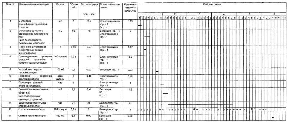 4.3. Калькуляция затрат труда составлена на электрообогрев бетона при замоноличивании шести стыков стеновых панелей с общим объемом бетона 1,1 м3 с помощью металлической опалубки, оборудованной пластинчатыми электронагревателями. Таблица 8